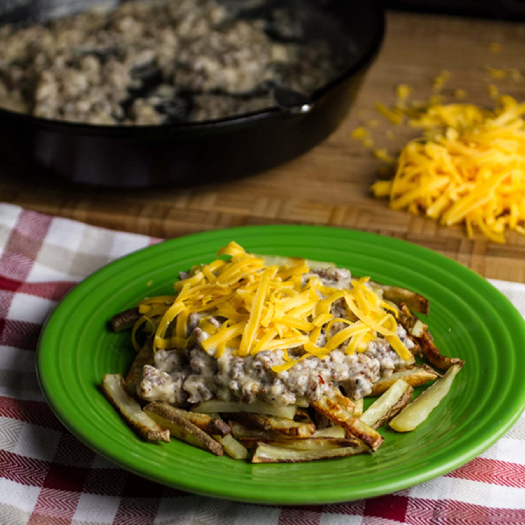 Southern poutine is fries, sausage gravy, and cheddar cheese. And delicious!