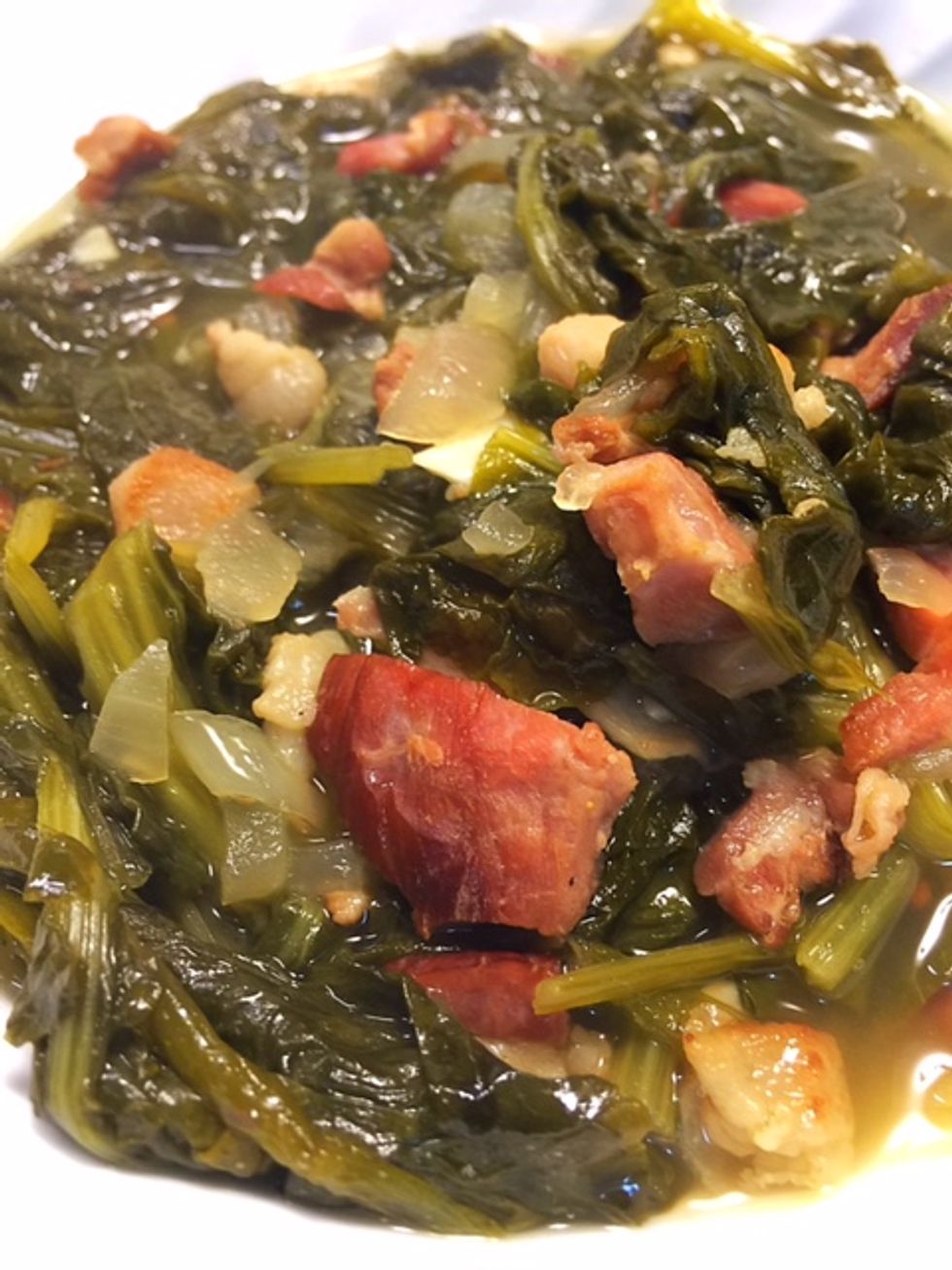 Cook chopped bacon in a pot or large dutch oven until more than half way done. Then add the chopped onion, and continue cooking until the onion is done.