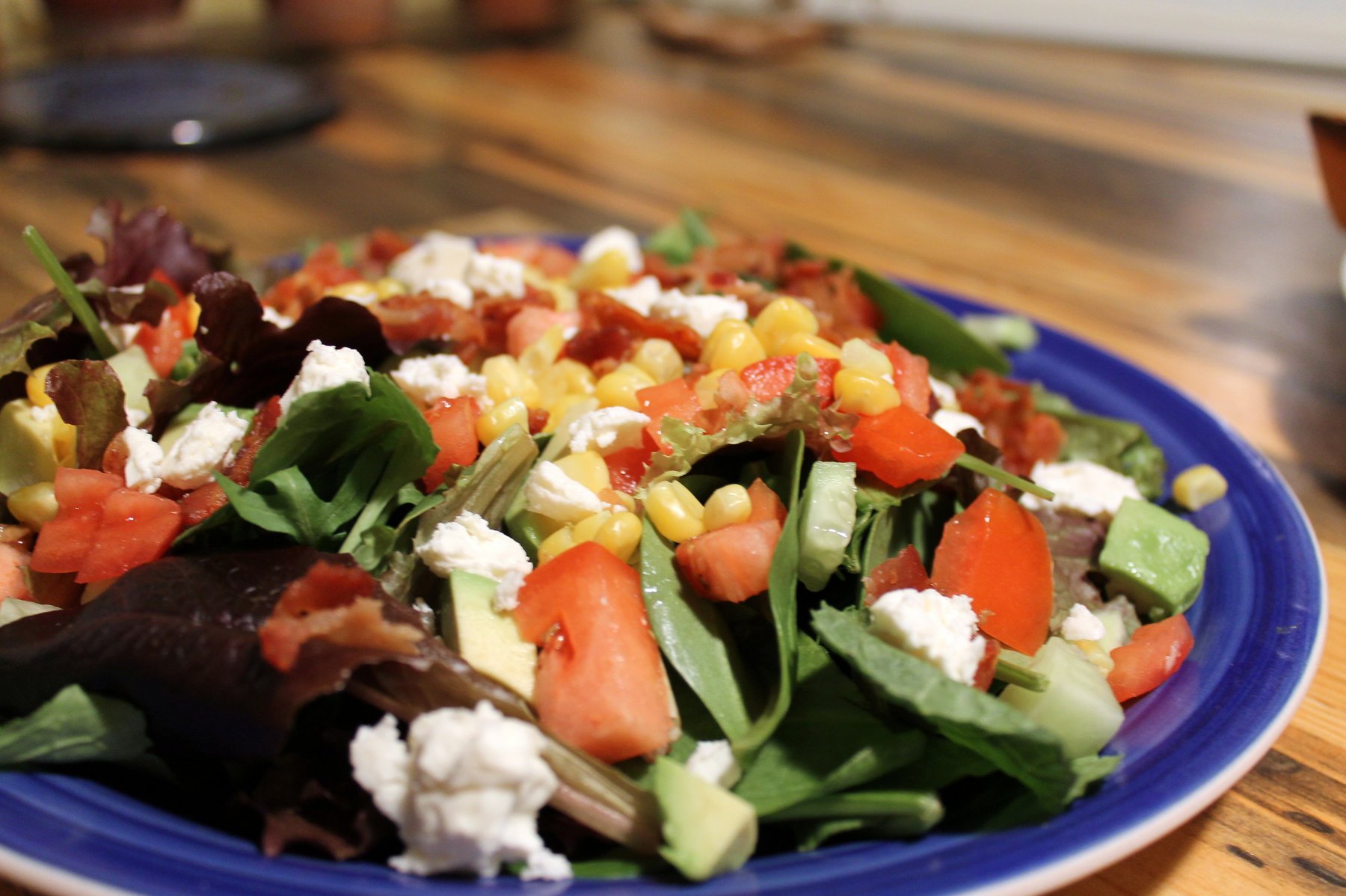 Layer the ingredients on a large plate. Top with dressing of choice and enjoy!