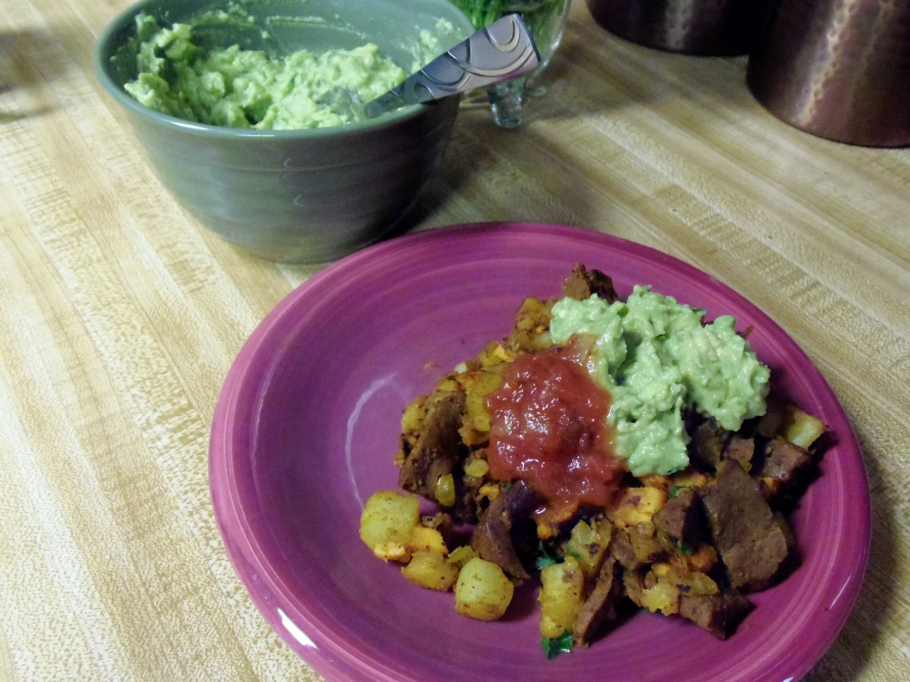 I saw a recipe last week online for a hash recipe that this one is based on. I wanted to use russet and sweet potatoes as well as Chorizo seitan to add more protein and keep with the Southwest theme. This was so good I made it Saturday and Sunday morning. You can whip up some guacamole while the dish cooks. I used a store bought salsa, although you could certainly make your own. Great flavors in this dish.