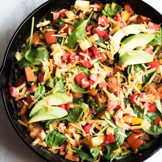 Southwestern sweet potato and ground beef skillet is loaded with fresh veggies and topped with cheese and avocado. A healthy, easy, and delicious dinner that your whole family will love. Ready in 30 minutes!