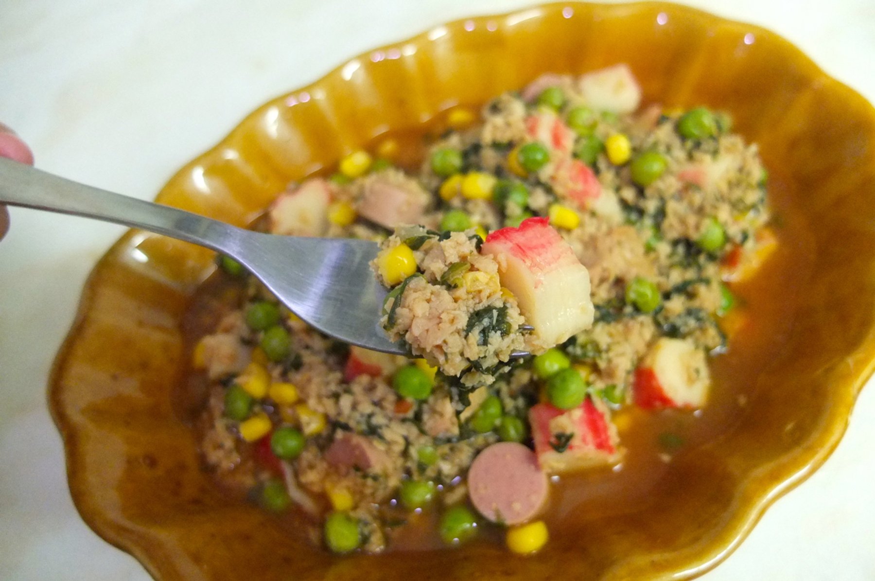 I love soy and cooking with several products from the soy bean. We usually have soy meal at home and this was the result of me craving something with soy, but also turkey sausages, kani kama (imitation crab meat), tuna and corn. =) I added a few other ingredients and came up with this delicious high protein, high fiber and low fat meal. If you haven’t tried soy meal, you’re actually missing out big time. It’s one of those amazing protein sources that – with good seasoning – can taste wonders. 5