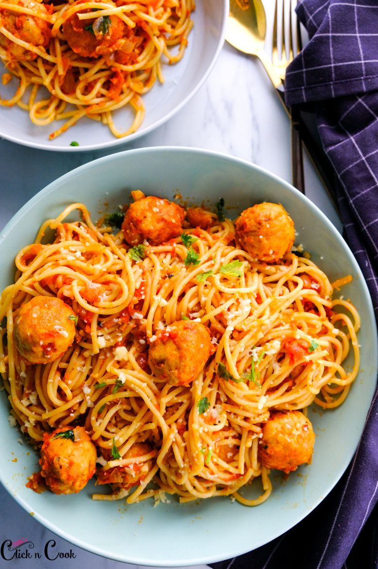 Spaghetti and meatballs Recipe – Tender and Juicy Chicken Meatballs drooling over an amazing Spaghetti sauce is something that will make anyone rave about. This steamy hot classic dish on a date night is simply the definition of love and comfort food.
