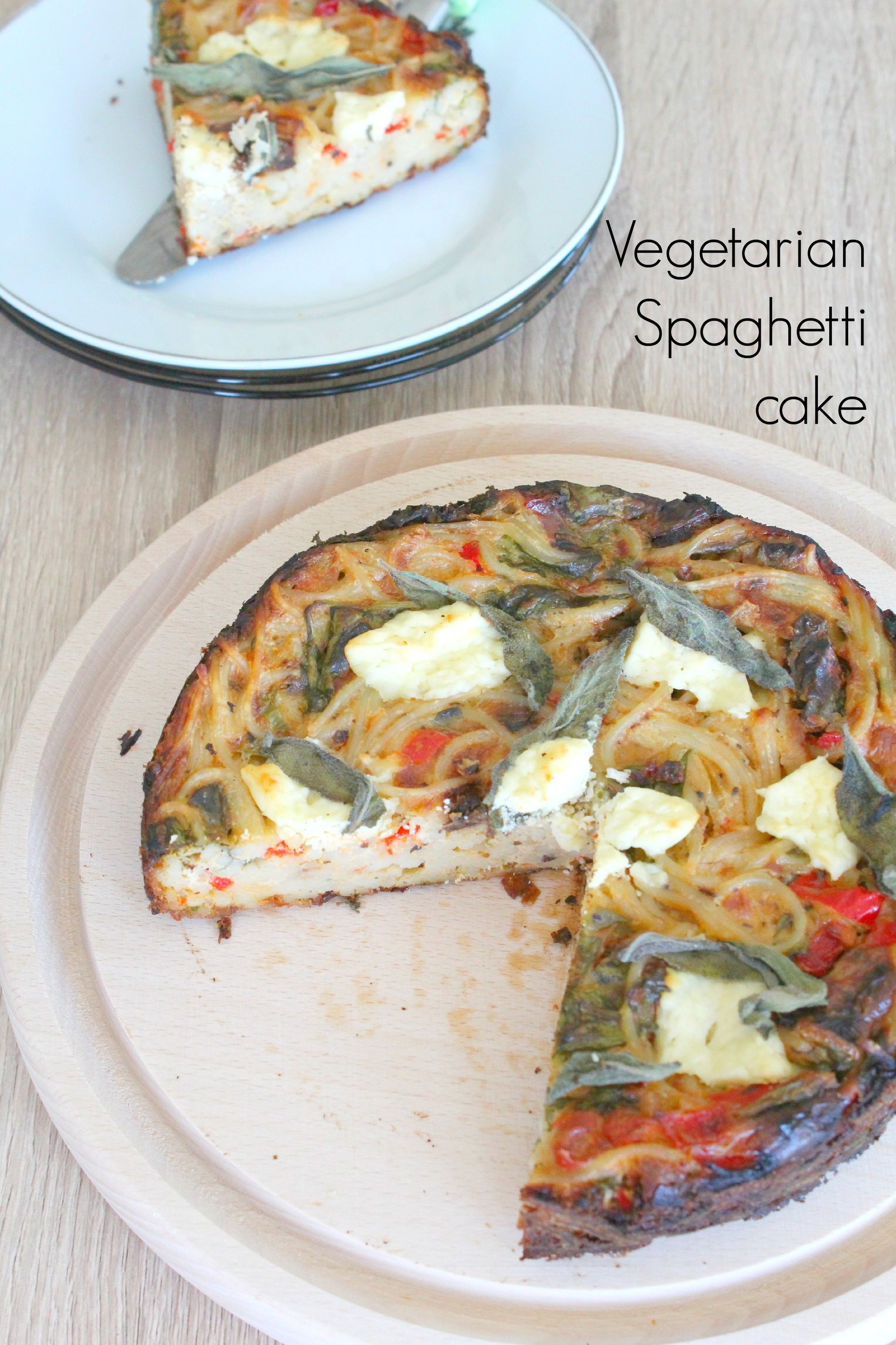 Spaghetti cake with sun dried tomatoes, goat cheese and baby spinach