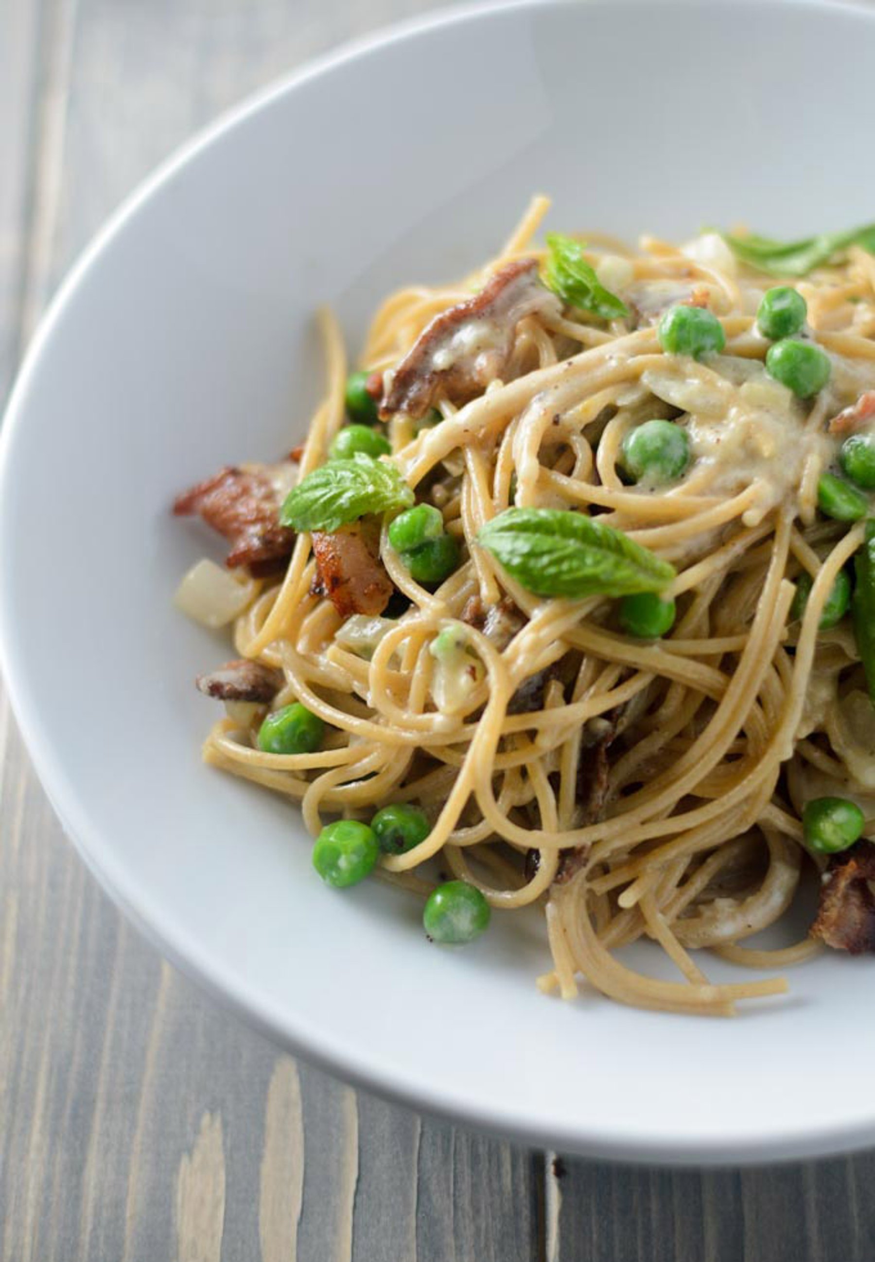 Prep the ingredients: Mince the cloves of garlic. Finely chop the onion. Go ahead and measure out your Parmesan cheese, milk, peas and oregano. You will want to act quickly when the pasta and bacon have...