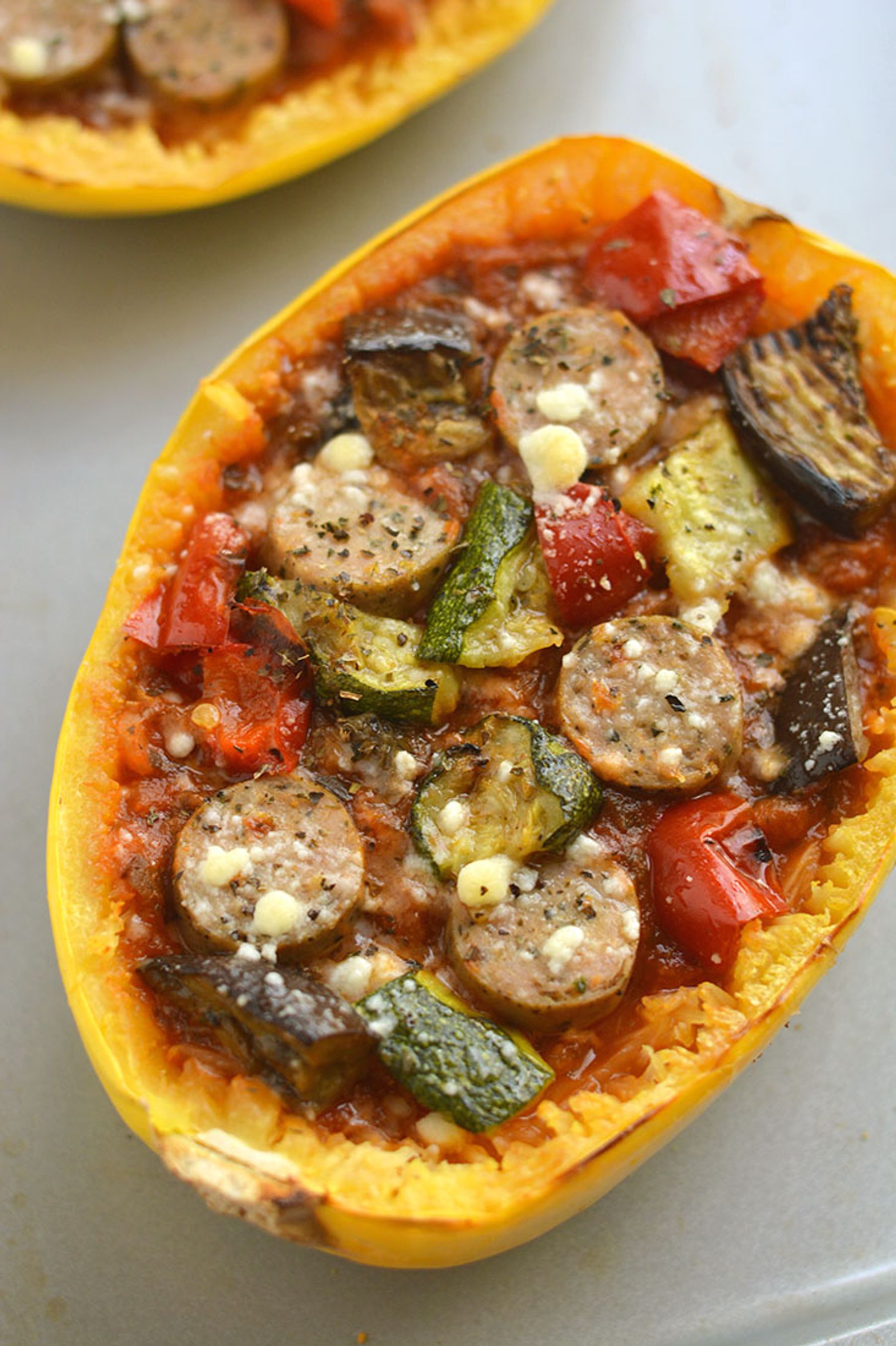 Spaghetti Squash Pizza! Customize with your favorite pizza toppings for an easy to make meal that's low carb, filling & delicious! Gluten Free + Low Calorie