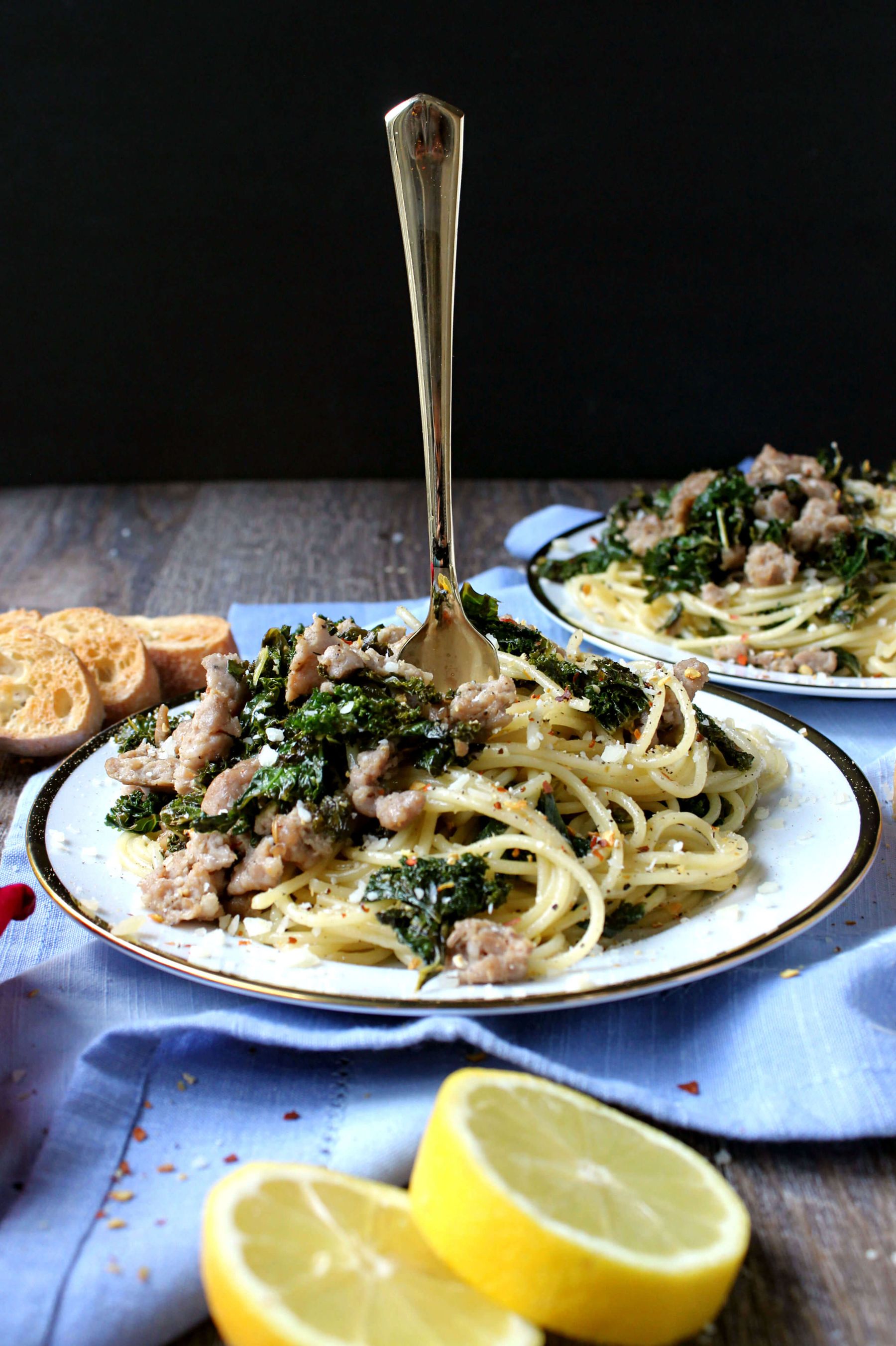 Main Dishes Spaghetti w/ Sausage & Kale, For Two - WRY TOAST Christine Fischer Hewit February 21, 2017 32 Flavorful, fast, and so romantic, there\\\'s nothing not to love about this 8 ingredient + 30 minute Spaghetti w/ Sausage & Kale! Low-Calorie Low-Fat