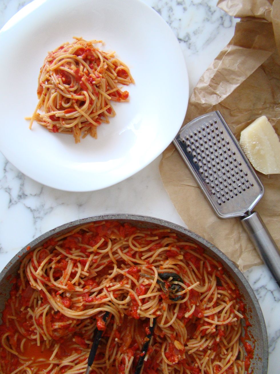 Fill a pot with water and 1/2 a teaspoon of salt and bring it to a boil. When it’s boiling, add the spaghetti and cook them according to the package instructions.