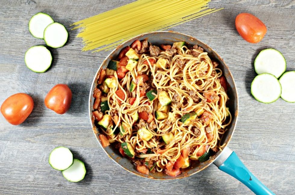Spaghetti with Zucchini & Tomatoes combines pasta, ground beef, onions, tomato sauce, seasonings, zucchini, and tomatoes. It is fast and healthy.