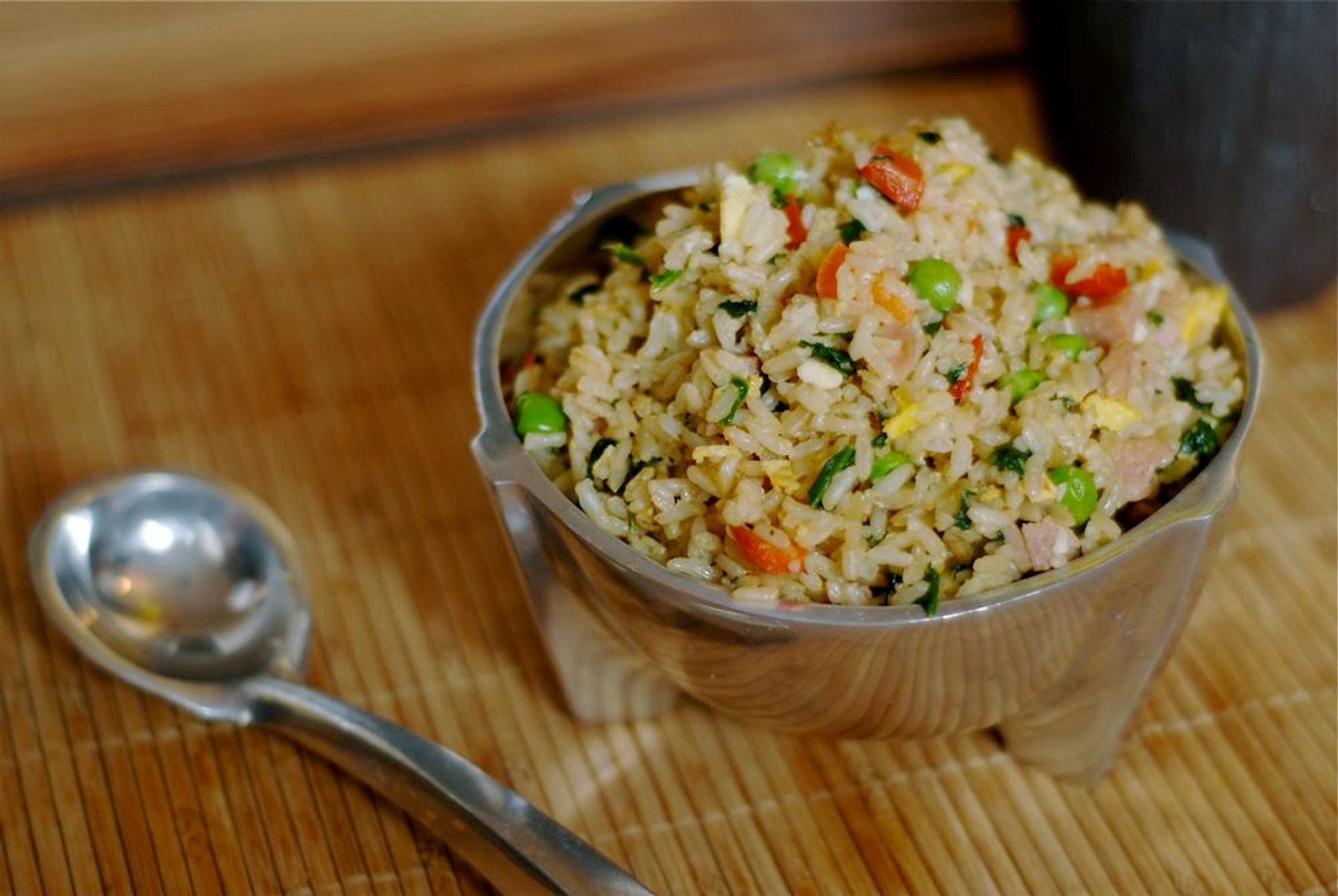 2. Turn heat to high. Add a little more cooking oil to a large saute pan (12"). When hot, add diced Spam to the pan. Cook until browned. Add green onions, fry until fragrant. Add spinach, fry until softened. Add remaining oil. Add rice and cooked eggs and toss to incorporate ingredients.
