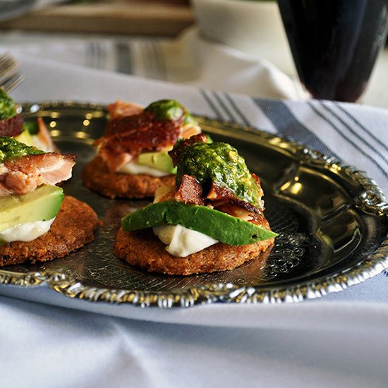 These little Smoked Salmon Appetizers are bursting with mind blowing amounts of flavor and guaranteed to impress. Homemade Cheddar and Chili Crackers are topped with a dollop of garlic mayonnaise, a slice of avocado, a few flakes of chili smoked salmon, and a spoonful of Chimichurri Sauce.