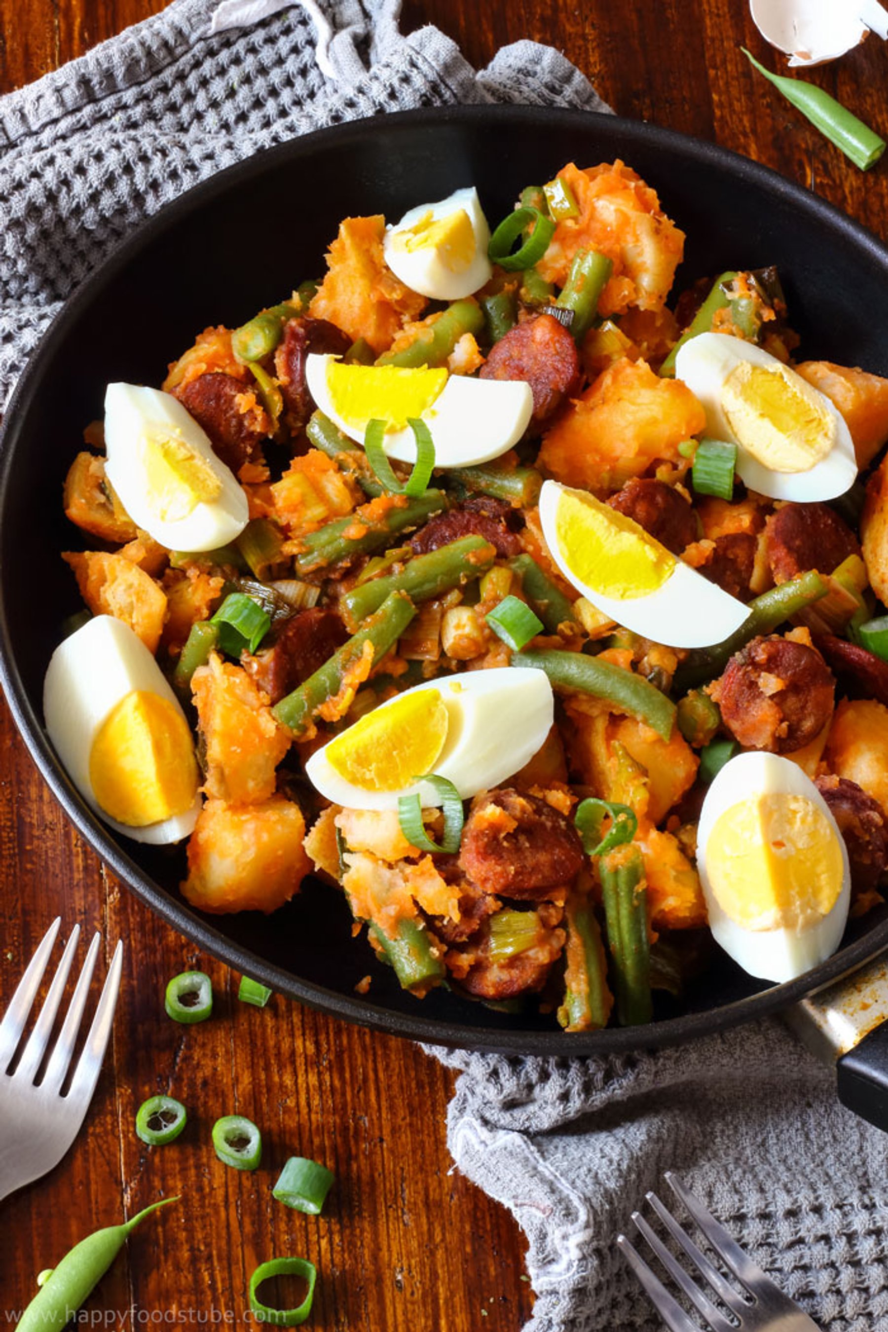 A quick recipe and tasty salad with potatoes, chorizo, eggs and green beans! An upgraded version of judías verdes con chorizo.