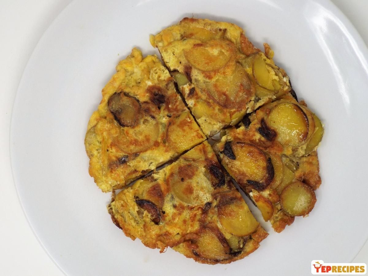 Thinly sliced potatoes and onions cooked with eggs in olive oil.