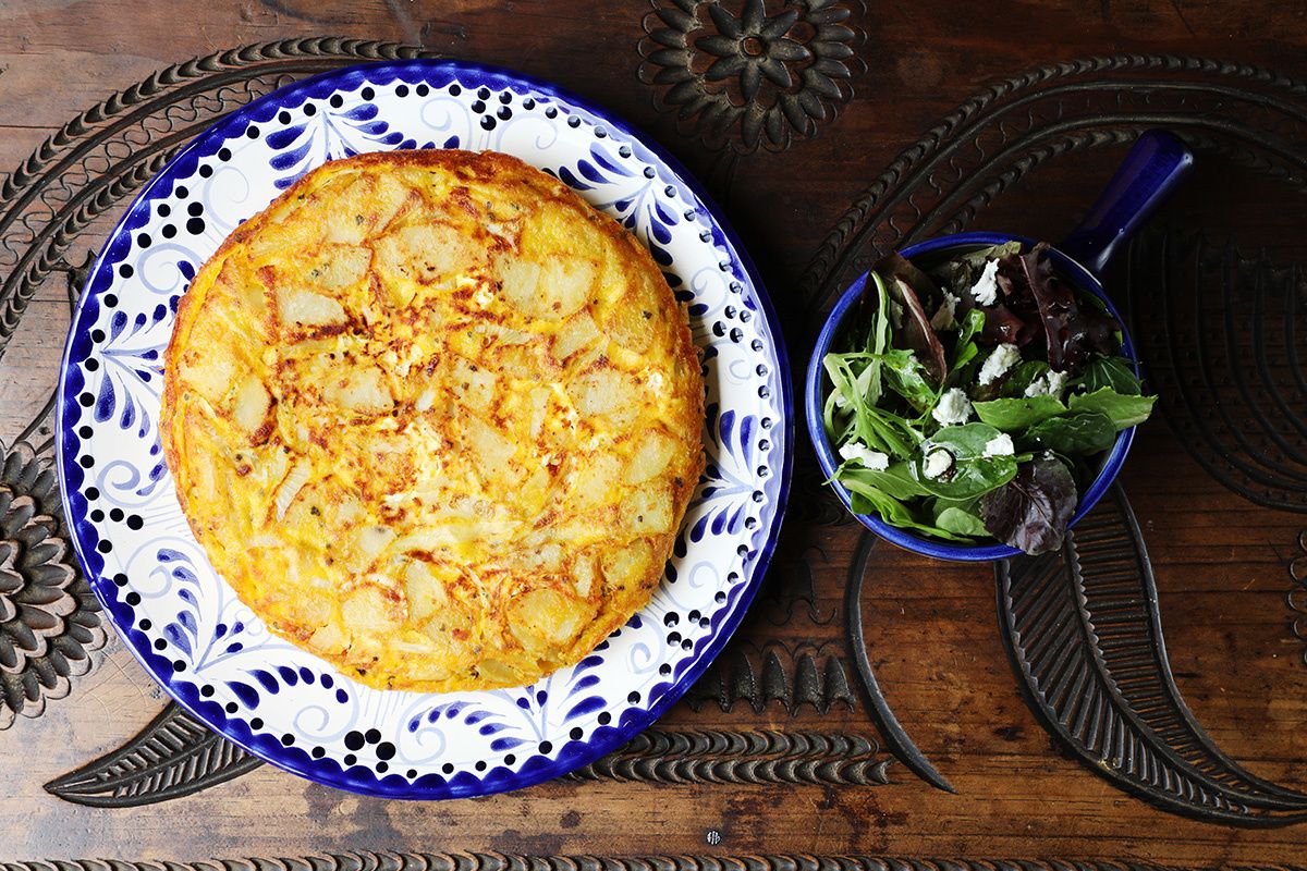 Spanish Omelette with a Mexican touch. Filled with potato, sauteed tomato, goat cheese, and a pinch of Mexican oregano.