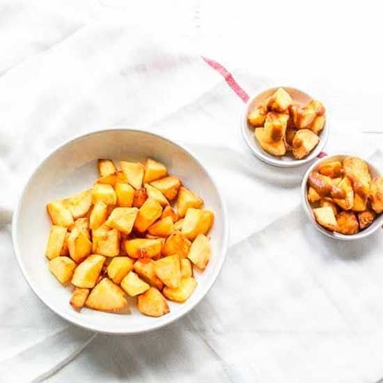 Patatas bravas are easy to make Spanish tapas. They are served in Spain as afternoon snack with a spicy sauce. The small potato cubes are crunchy on the outside and soft on the inside.