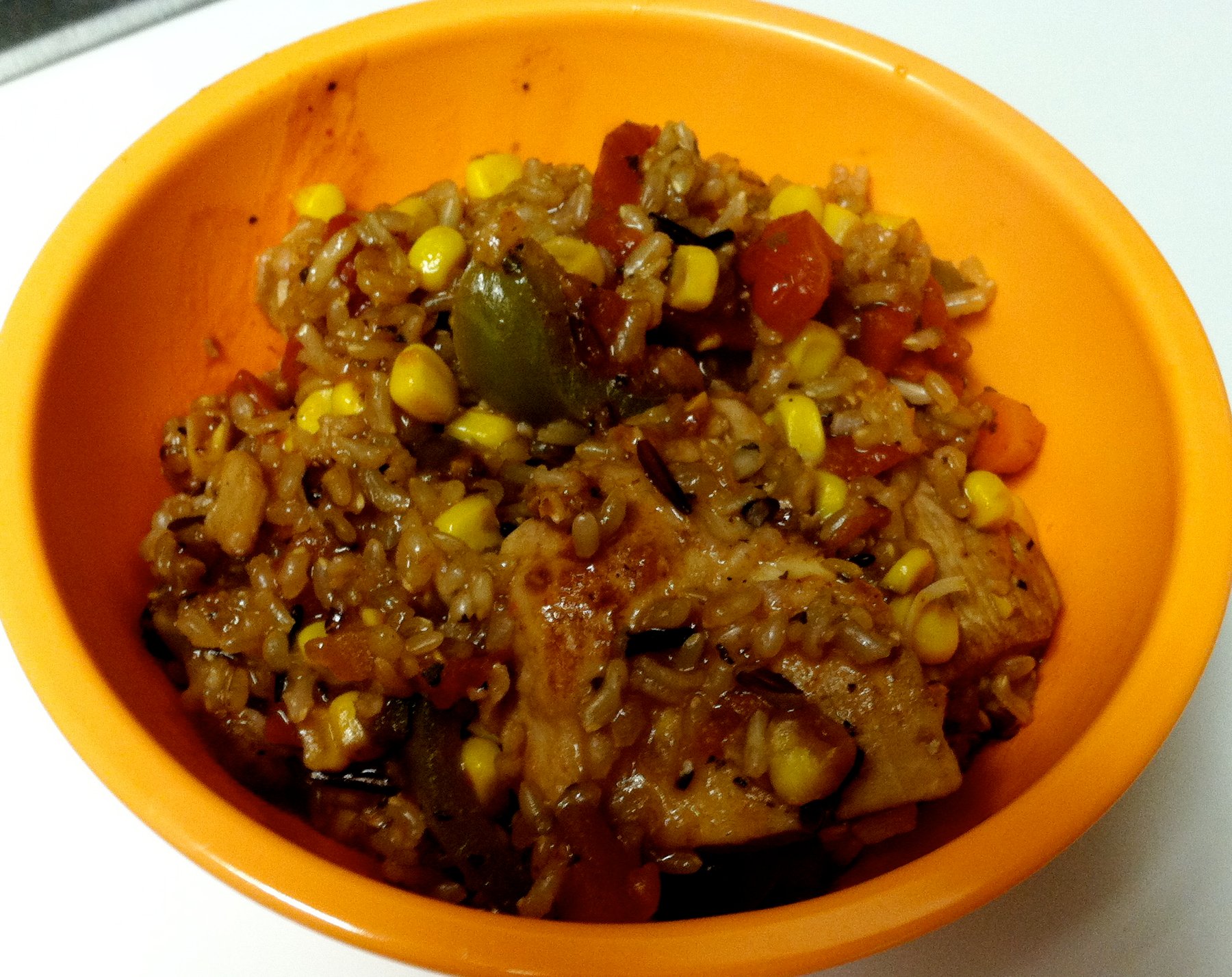4. Add the peppers, carrots, tomatoes, corn and reserved marinade. Mix together and then add the partially cooked rice.