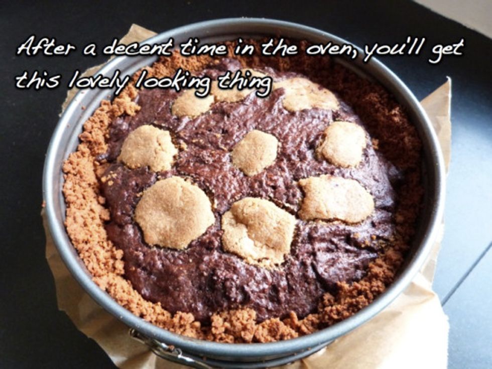 Good and cold? Done waiting? Pour brownie batter into crust. Place 8 cookie balls equidistantly around the tin (one for each piece). Place a ninth in the centre.