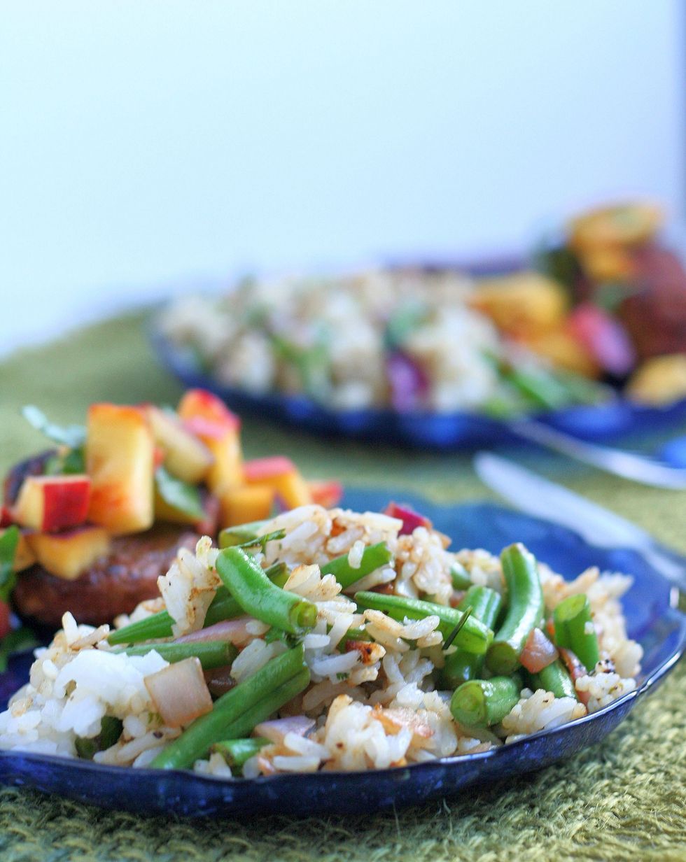 Spice-Rubbed Pork Medallions with Peach Salsa & Cilantro-Green Bean Rice