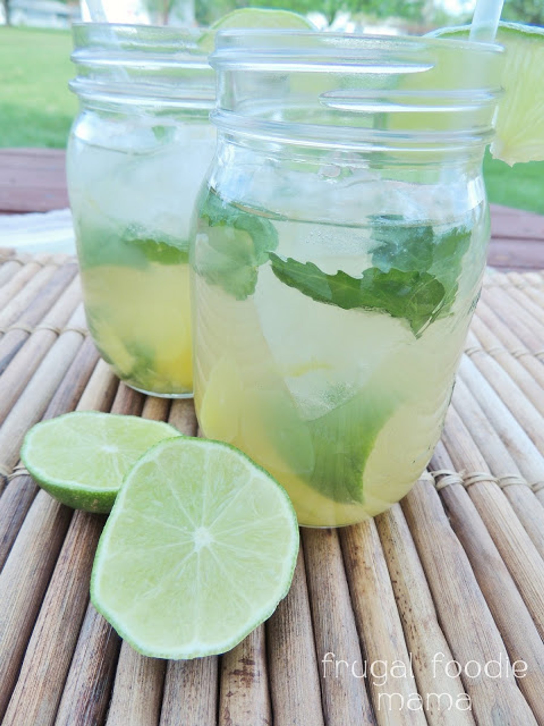 Squeeze the juice from the lime quarters into a cocktail shaker. Throw the quarters in there and then add in the mint leaves, pineapple chunks, and sugar. Using a pestle or a wooden spoon, muddle together...