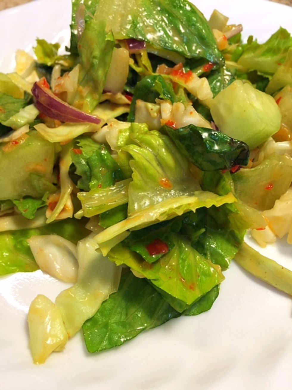 A quick easy to make spicy Asian chopped salad. The dressing is made from scratch.