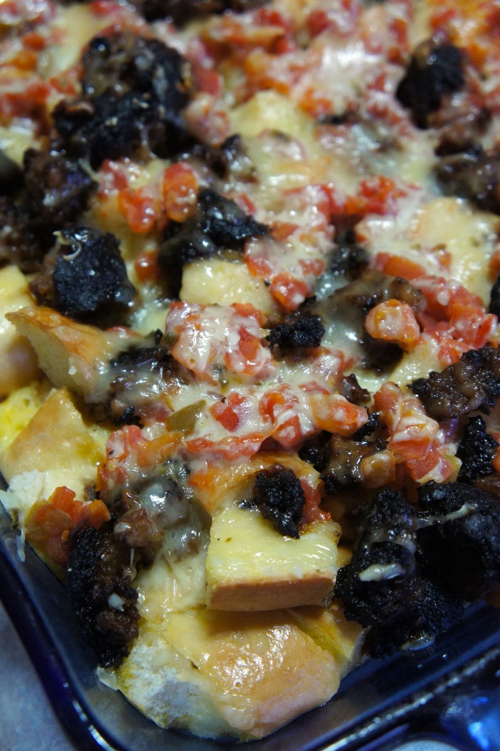 A breakfast casserole made with bagels the night before and bake the next morning.
