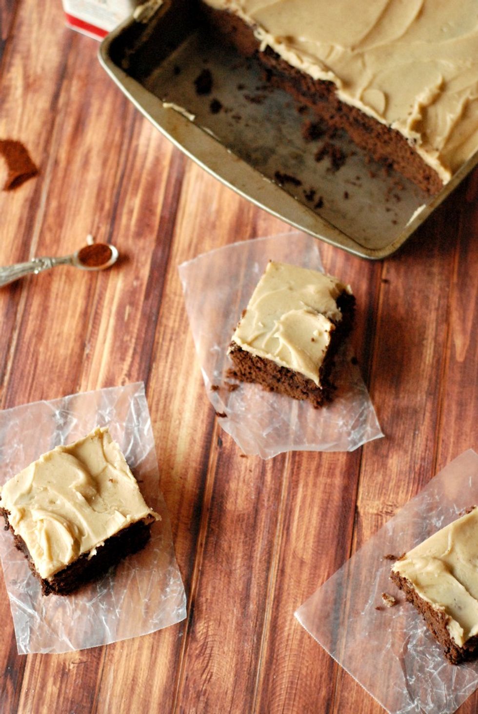 A rich cake like chocolate brownie covered in a sweet and subtly spicy caramel frosting!