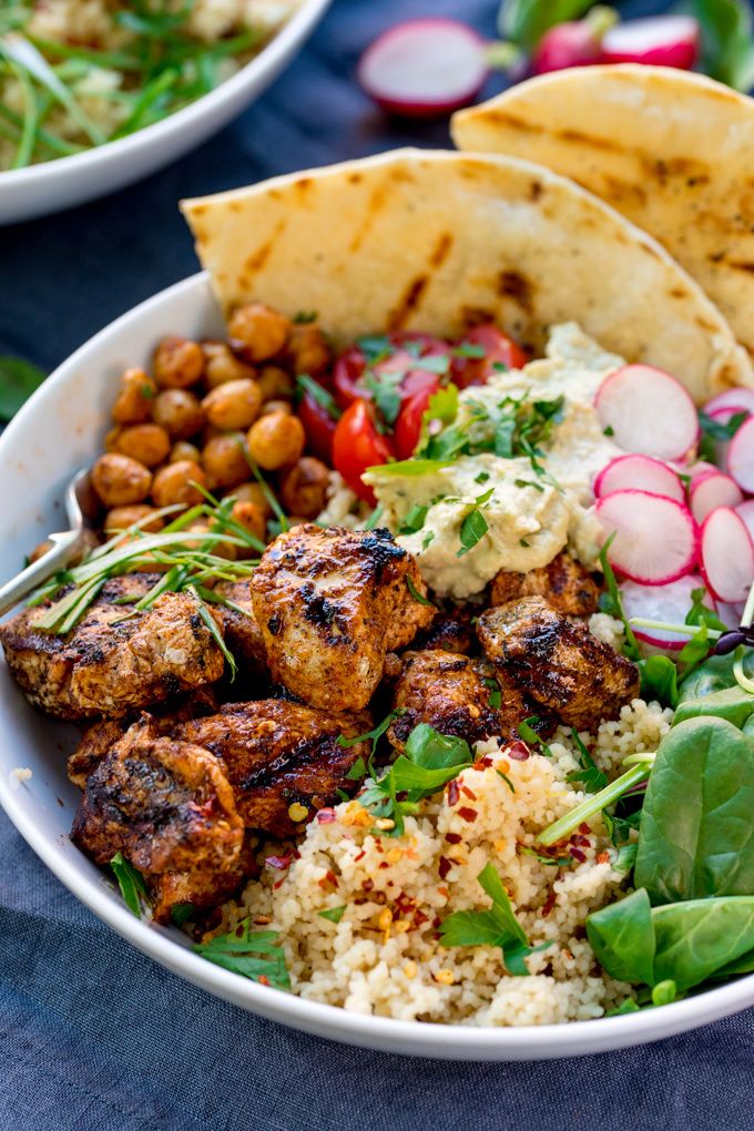 Spicy Chicken Nourish Bowl - A filling and nutritious warm salad, with middle eastern flavours -perfect for Fall. A healthier Autumn dinner.
