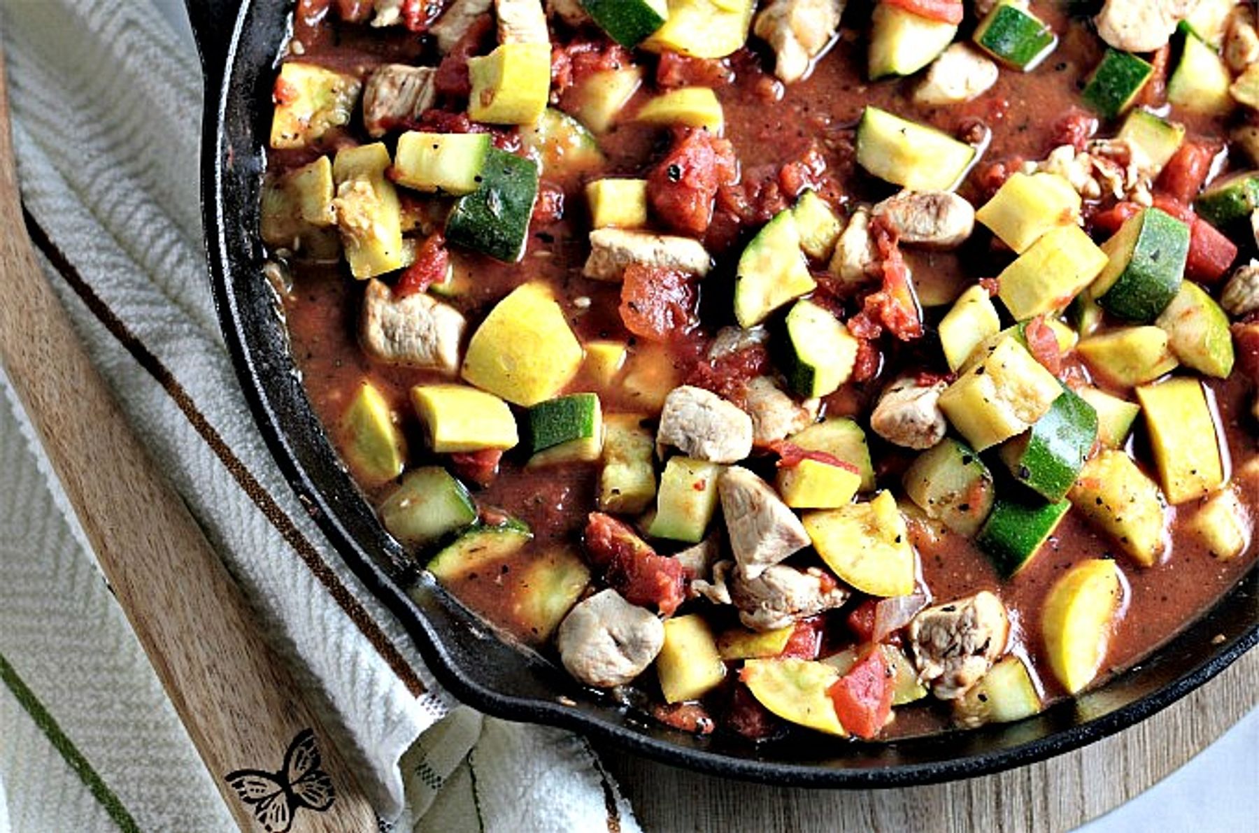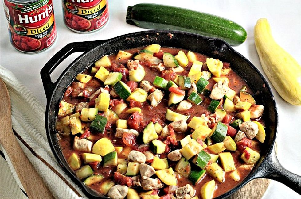 Spicy Chicken, Squash and Tomatoes features olive oil, chicken, zucchini, yellow squash, Hunt’s canned tomatoes, and onions with herbs and spices.