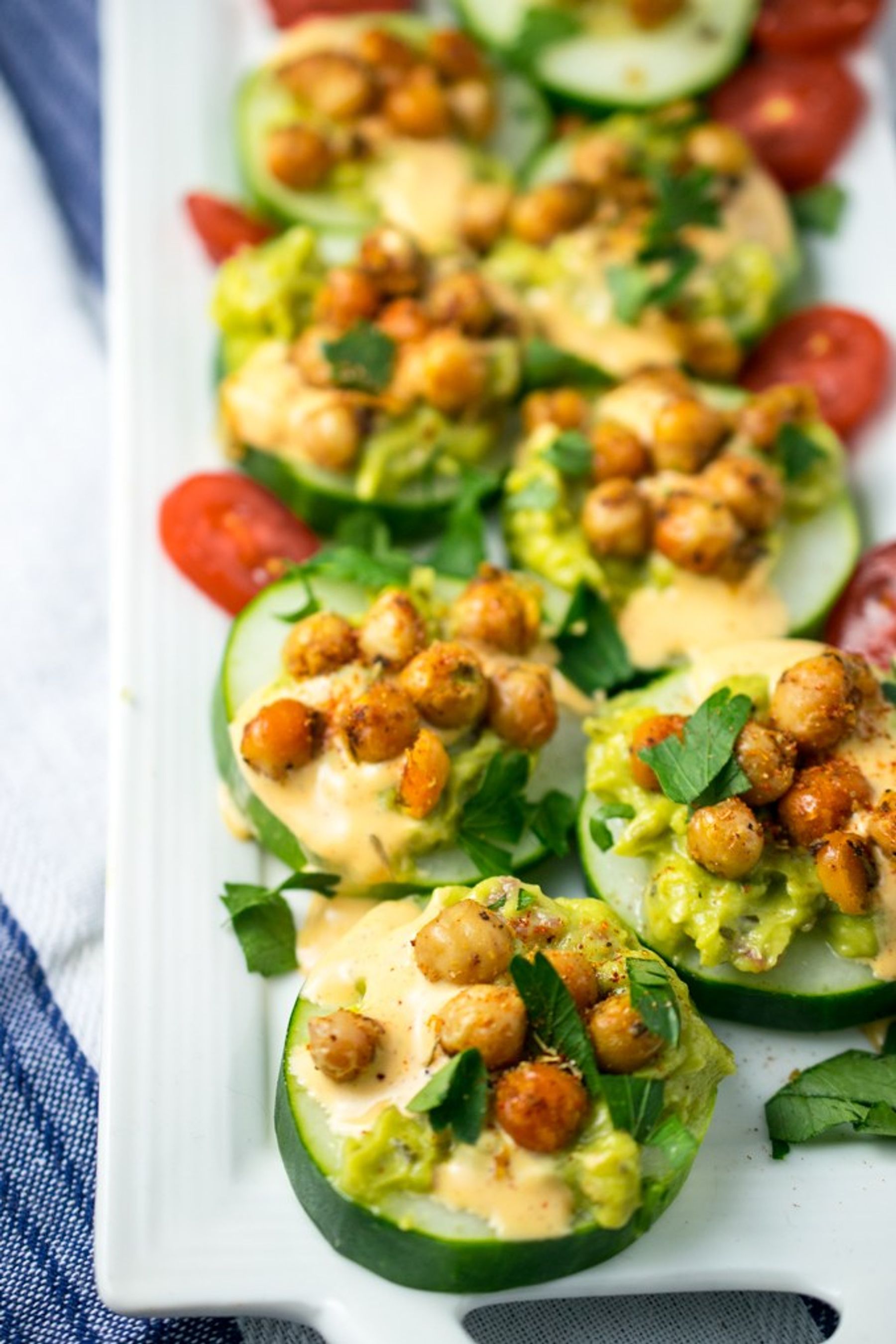 Easy and refreshing spicy chickpea avocado cucumber bites with chipotle crema and fresh herbs.