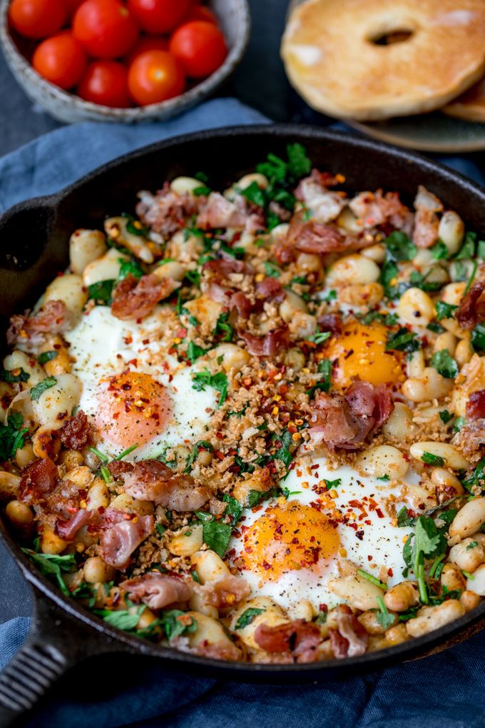 No, it's not shakshuka. Not a crushed tomato in sight! This is my Spicy Egg Breakfast with Smashed Beans and Pancetta!