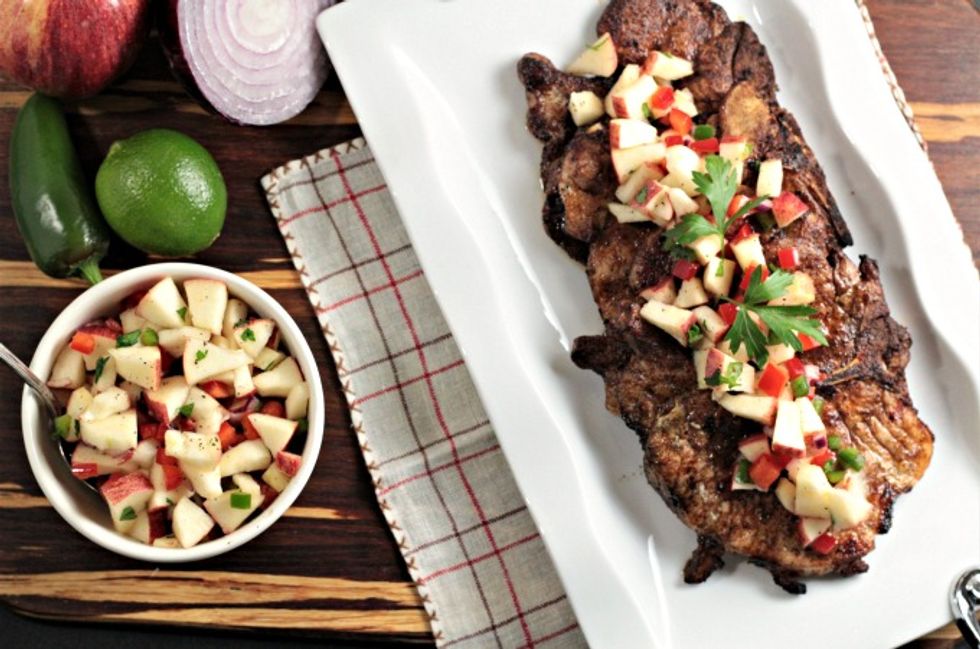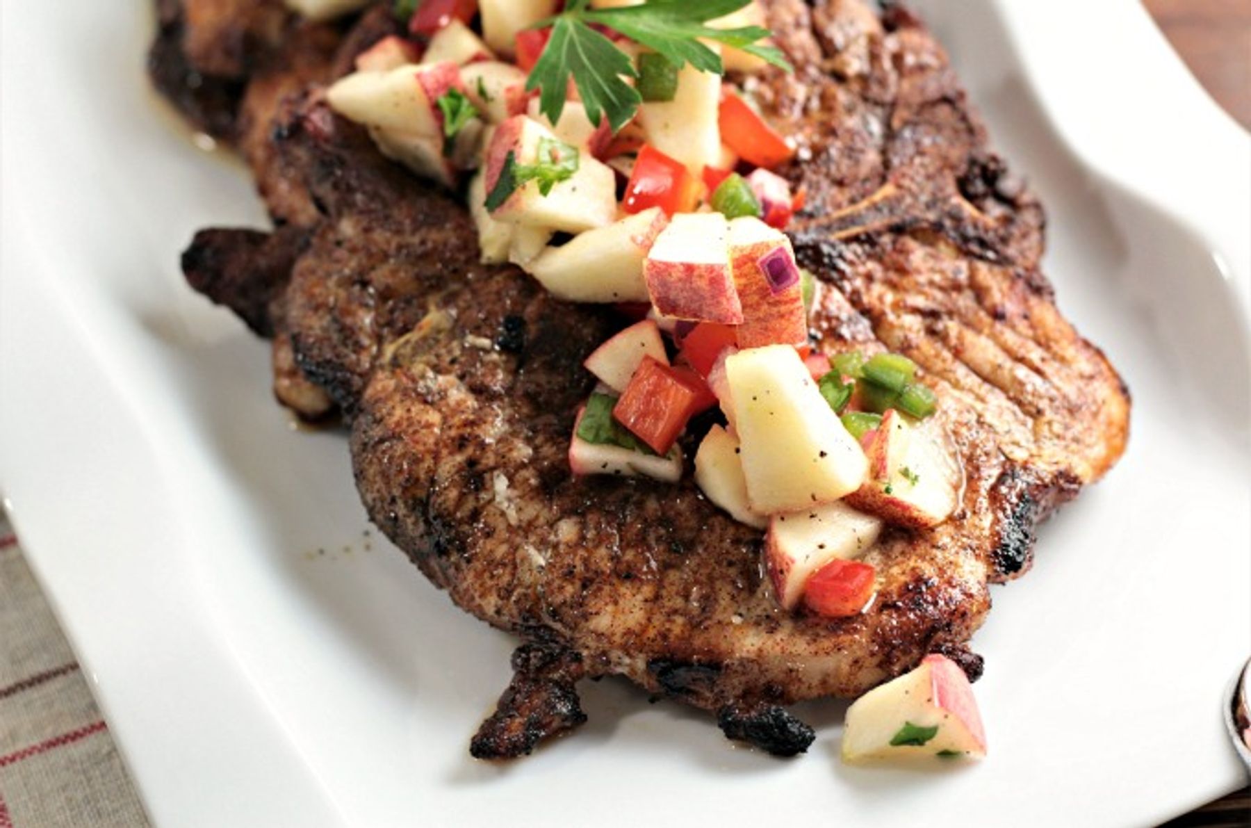 Spicy Grilled Pork Chops with Apple Salsa features marinated pork and an apple salsa made with fresh fruits and vegetables. Impressive and delicious!