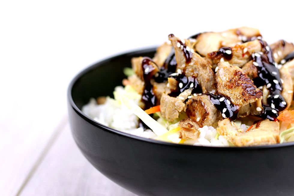 Spicy Hoisin Chicken Bowls over wilted cabbage, carrots and sticky rice in a quick weeknight meal!