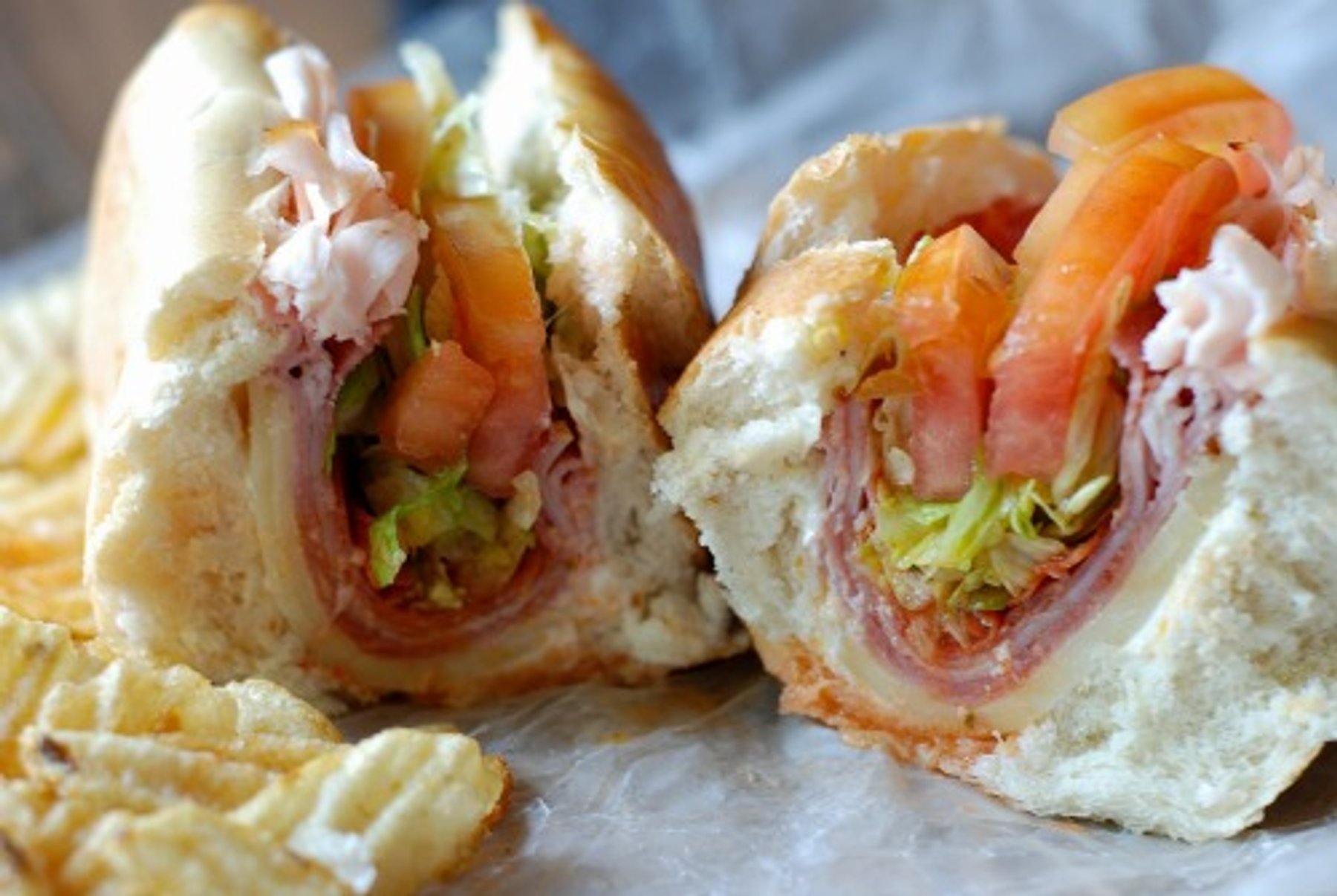 Deli meat and cheese piled into a sub roll with lettuce, tomato and spicy dressing.