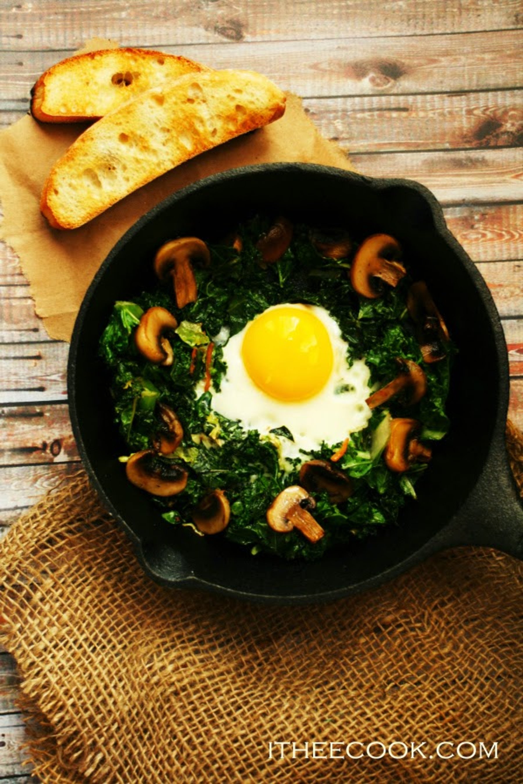 This simple, rustic dish is both healthy and hearty. Winter kale with garlic, green onions, and mushrooms. Protein packed egg is lightly cooked into the bed of kale and topped with a punch of heat from the red pepper flakes.