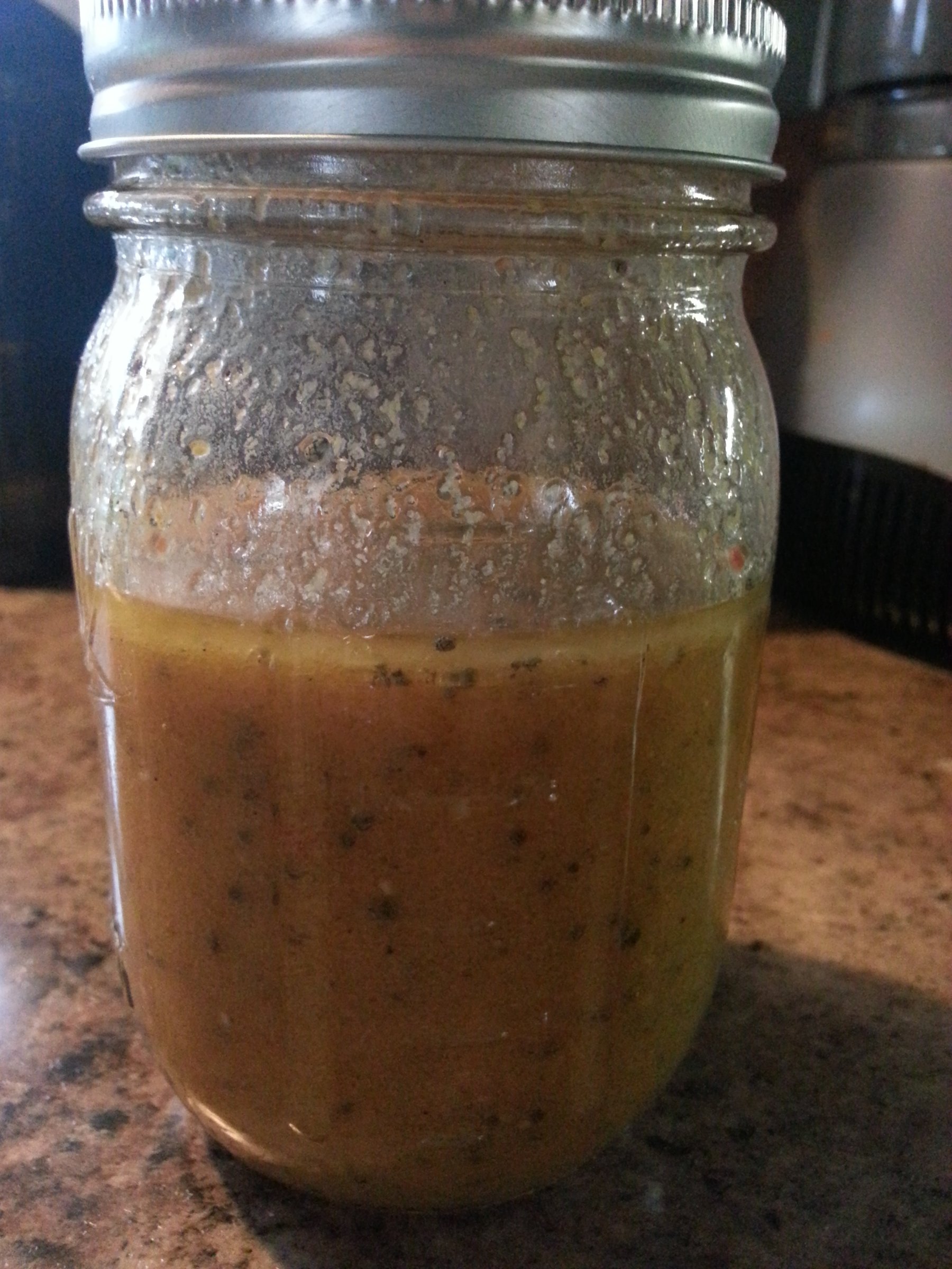 a spicy mustard vinaigrette with chia seeds. the seeds swell and thicken which keeps the vinaigrette from breaking