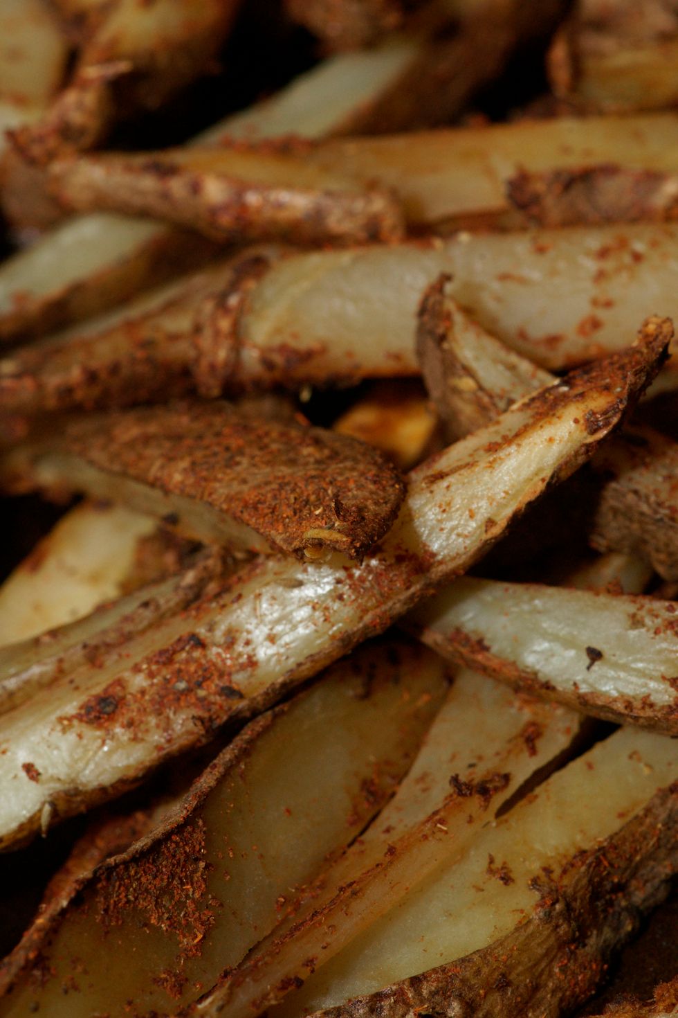 Wash potatoes and cut into fry shaped wedges (I leave skins on).