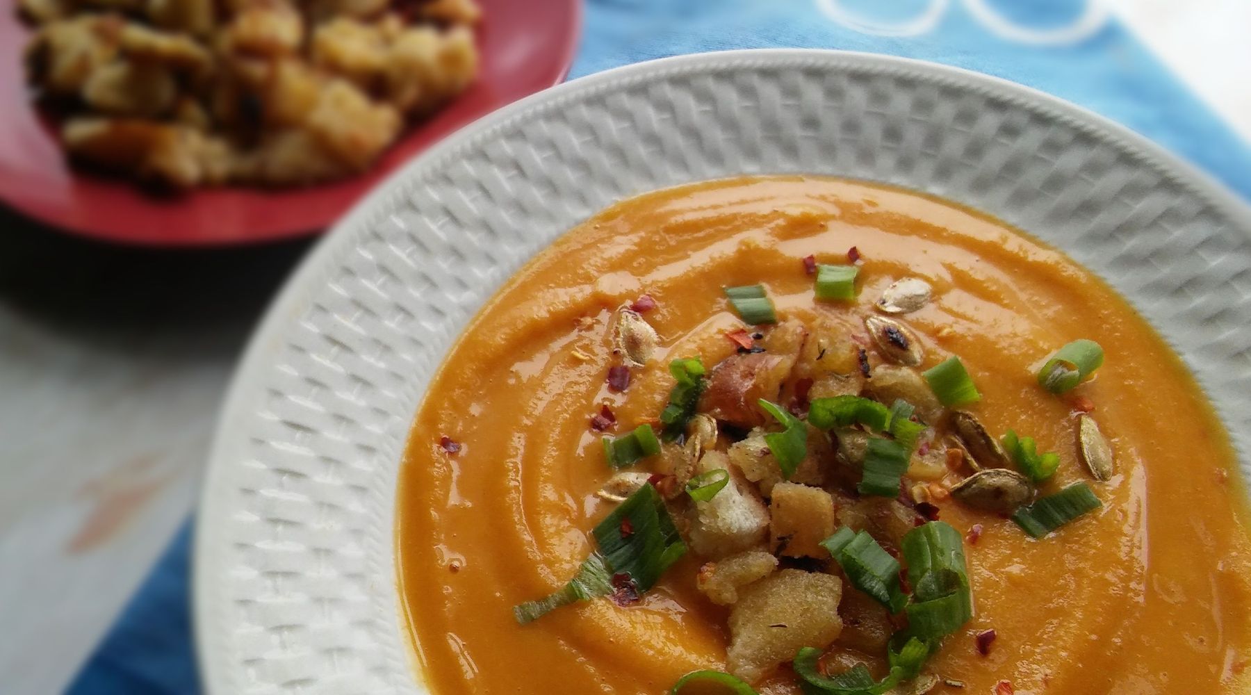 SPICY PUMPKIN SOUP WITH ROASTED PUMPKIN SEEDS AND GARLIC CROUTONS