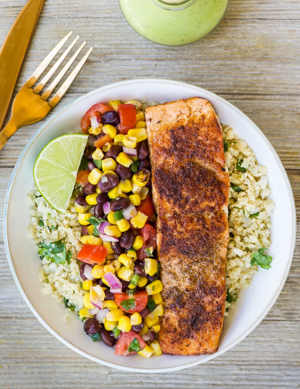This Spicy Salmon Burrito Bowl with corn salsa, cauliflower rice & cilantro lime dressing adds a fun twist on a Mexican favorite!