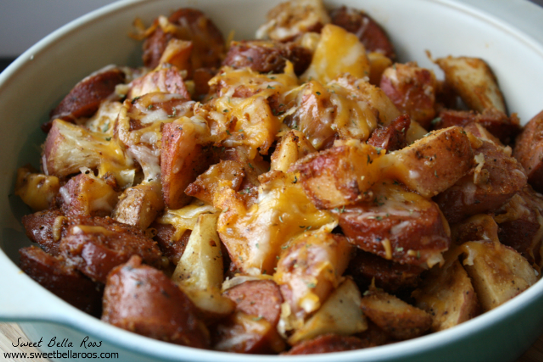 Preheat oven to 425 degrees. Spread the frozen potatoes on a cookie sheet (I line mine with parchment paper). Mix together olive oil, pepper, paprika, garlic, and wing sauce. Slice the sausage into 1/2in...