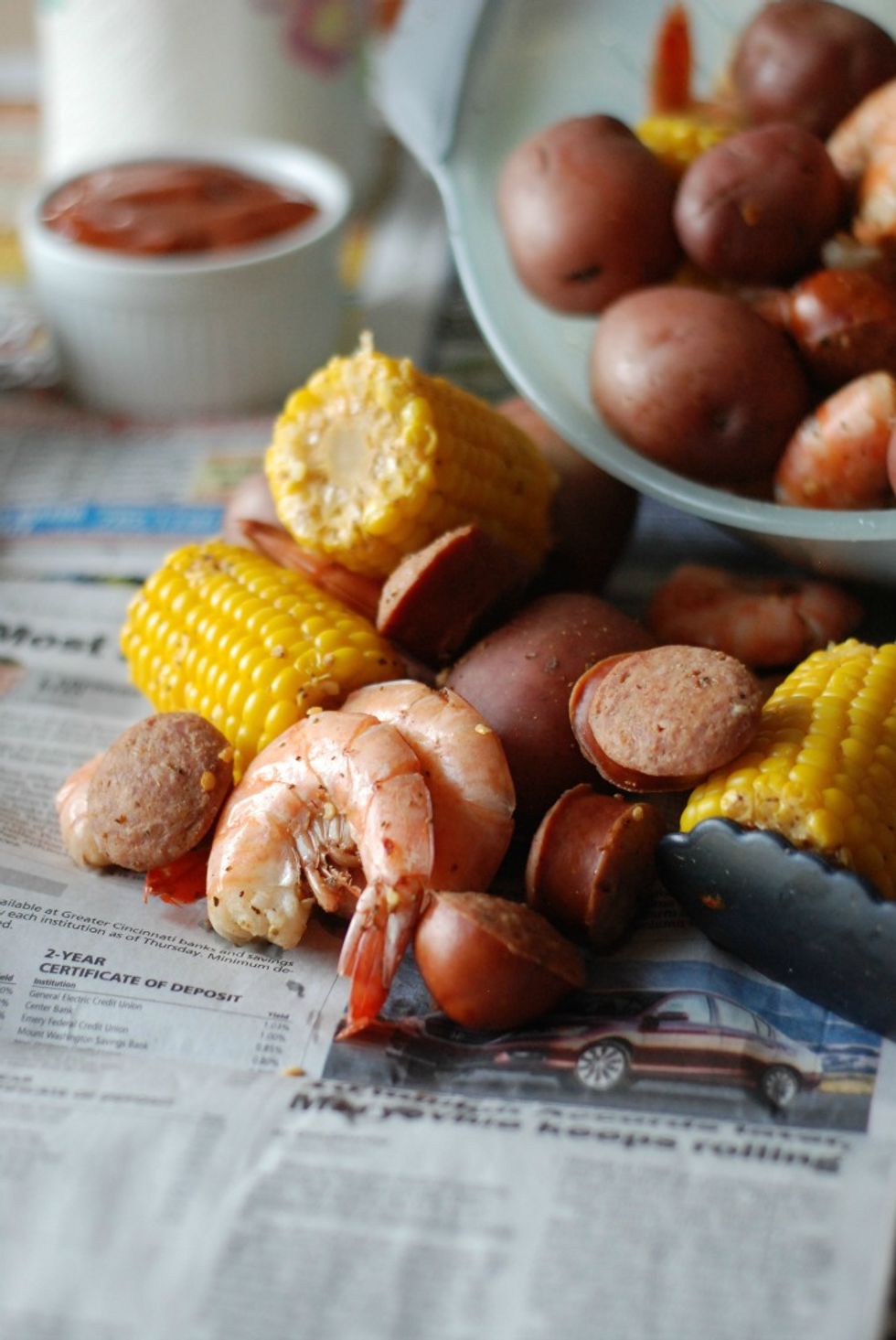 Fill a very large stockpot with water (I used two) halfway. Bring to a boil and pour in Old Bay seasoning along with potatoes and garlic. Continue to boil for 15 minutes. Add sausages and boil for 5...