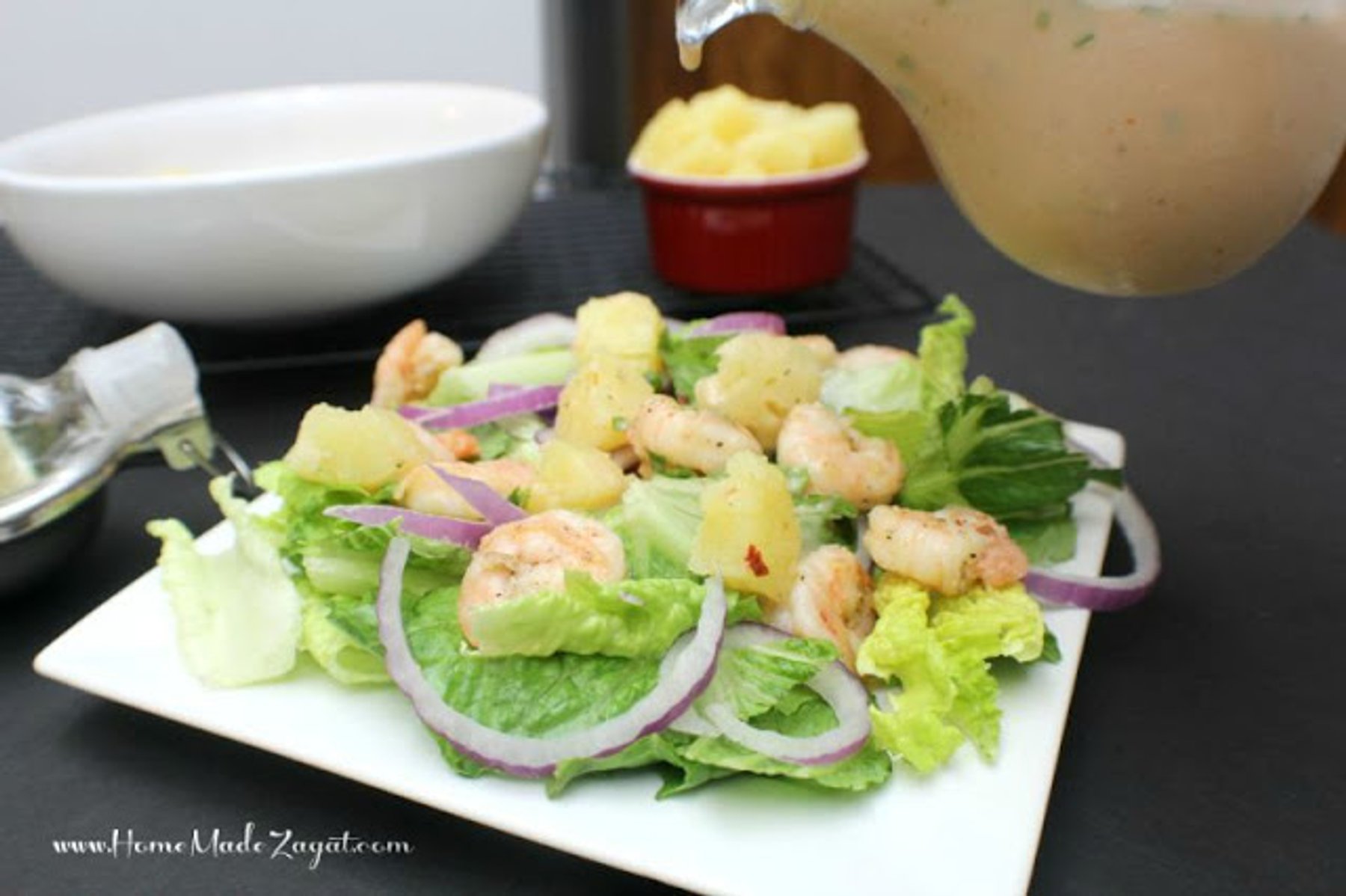 A refreshing spicy sauteed shrimp with pineapple drizzled with a dressing infused with fruit and peppers.