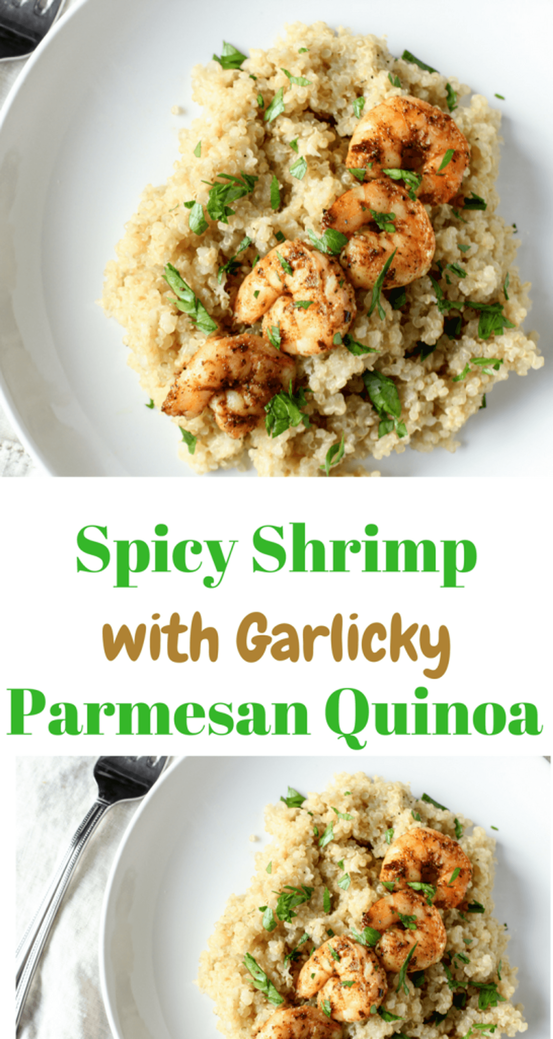 Main Dishes Spicy shrimp with garlicky Parmesan quinoa Megan StevensonAugust 23, 2017 7 10http://megsmealplanning.com/2017/08/12/spicy-shrimp-with-garlicky-parmesan-quinoa/See the full directions on my site
