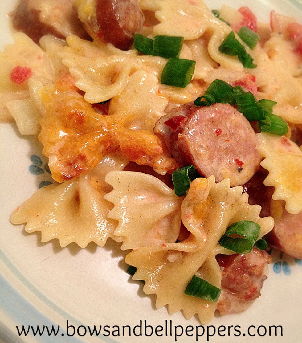 Easy dinner recipe. Smoked Sausage with bow tie pasta and spicy cream sauce, topped with cheese.