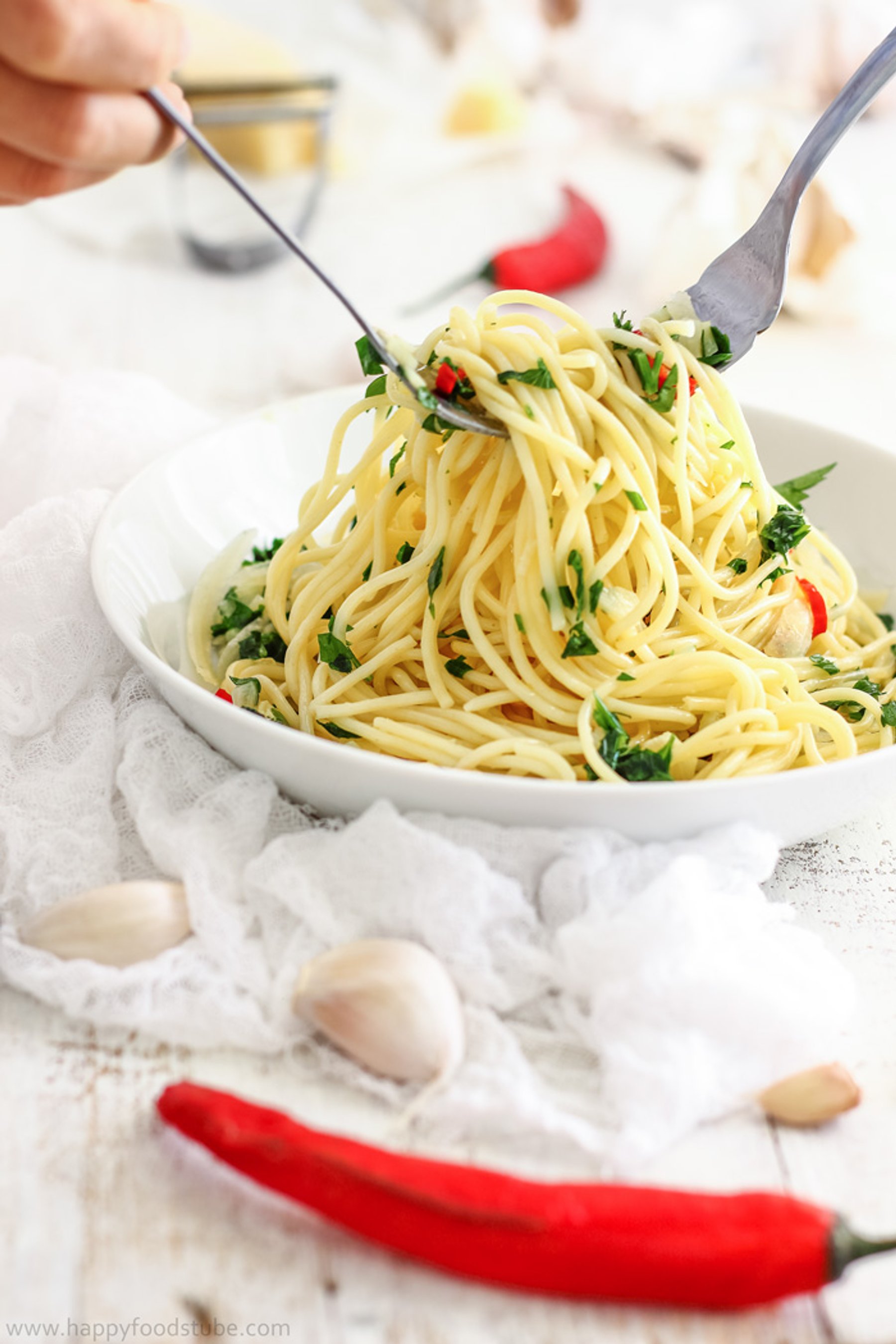 Simple & quick spaghetti dish with garlic, olive oil, chili & finished off with parmesan. A perfect weeknight dinner!