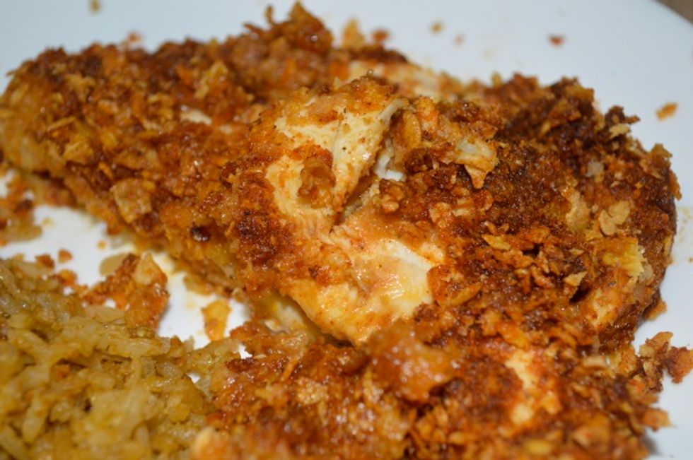 4. Crush the corn flakes to a fine dust and toss together with the taco seasoning. Coat the chicken with the corn flake mixture, reserving the marinade.