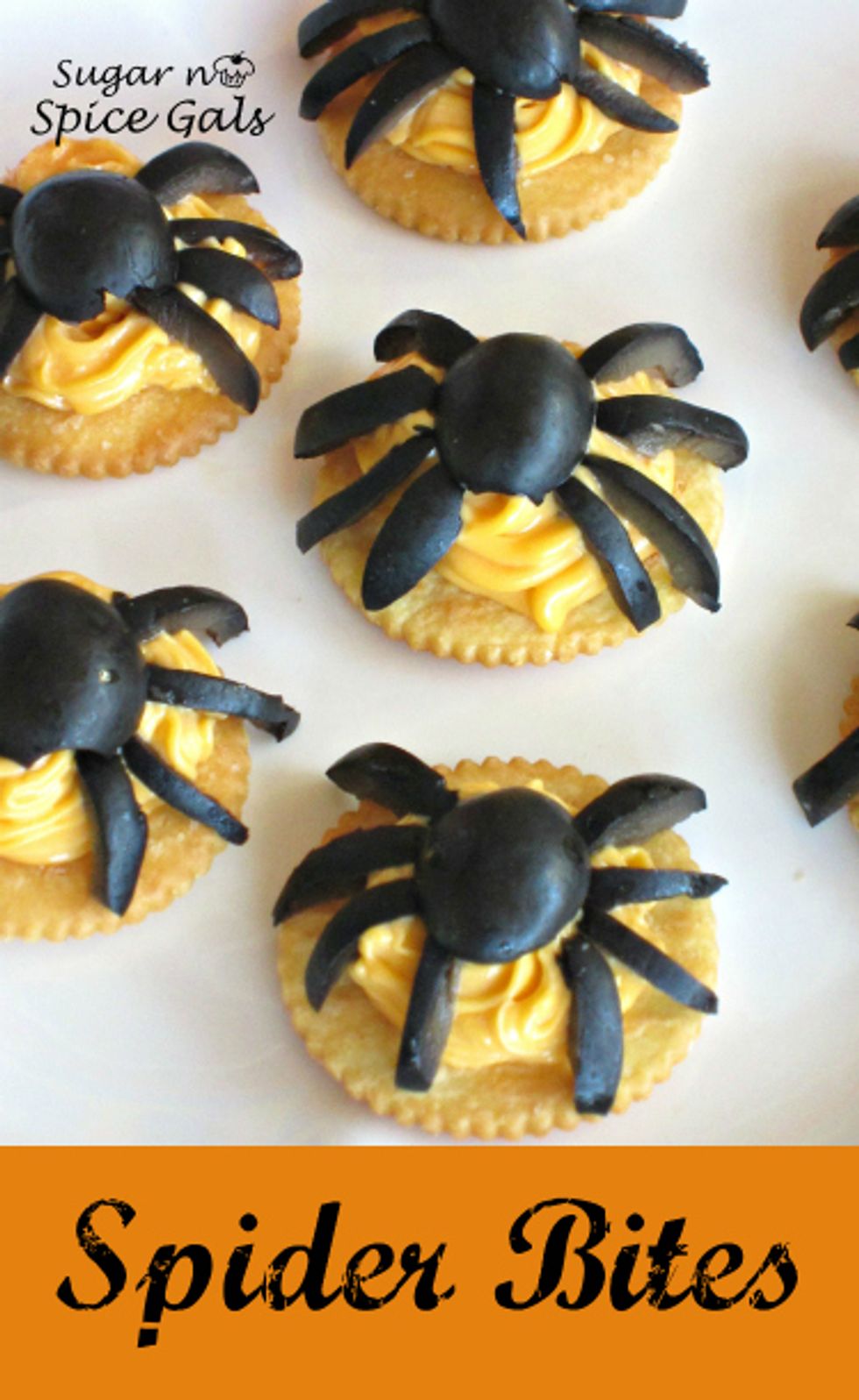 To make one spider, squirt the cheese on the Ritz Cracker. Cut an olive in half, using one half for the body and the other half you are going to cut into thin slivers for the legs. A spider has eight...