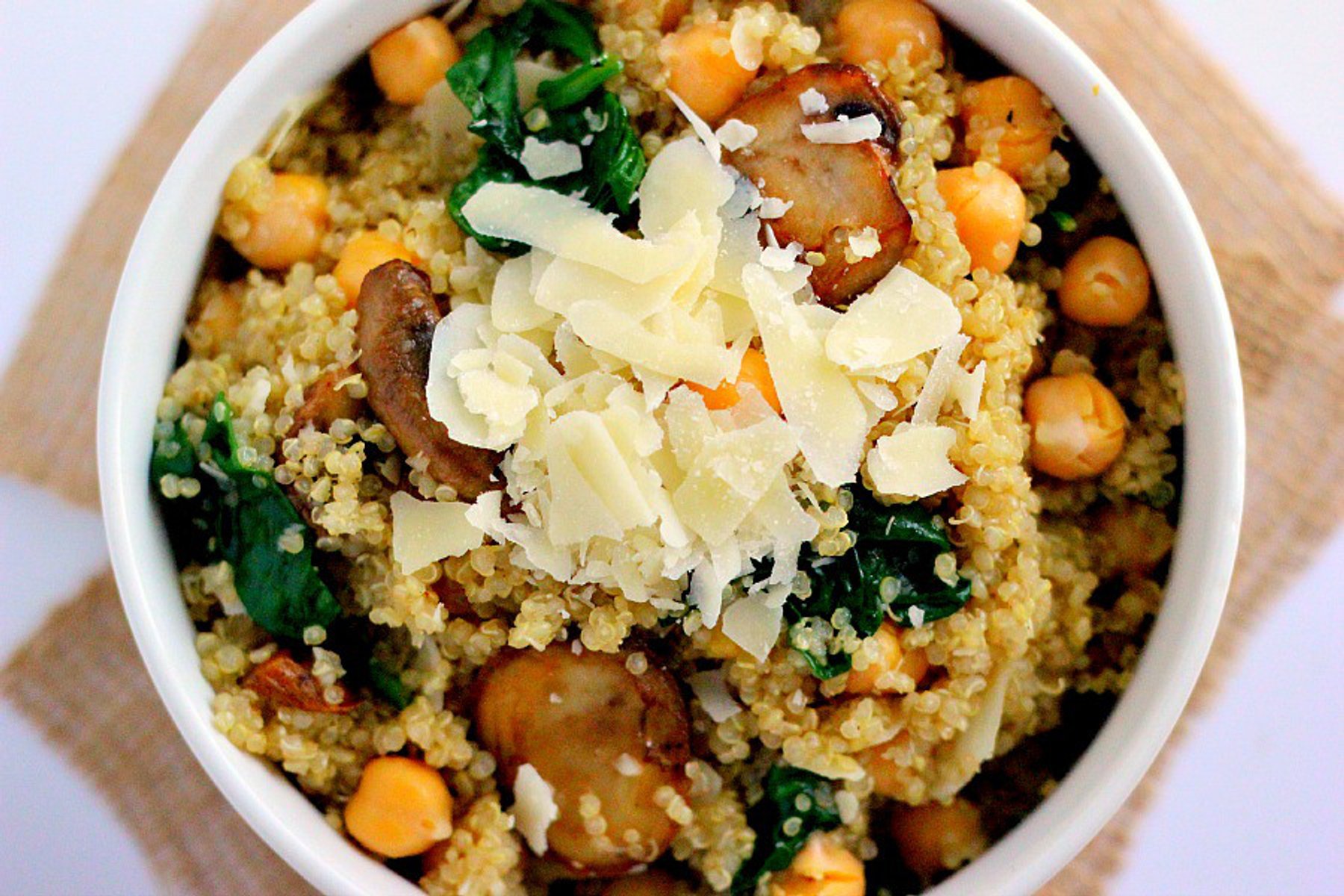 Loaded with fresh spinach, mushroom, chickpeas, and Parmesan, this Spinach and Mushroom Quinoa Bowl is jam-packed with protein, veggies, and is ready in no time!