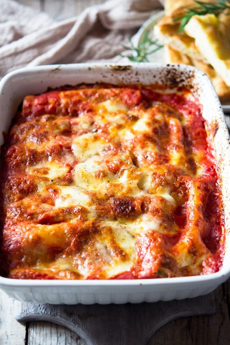 Spinach and ricotta cannelloni, a classic, foolproof recipe and a family favourite. Cannelloni pasta tubes filled with a creamy spinach and ricotta filling, baked in a super simple and delicious tomato sauce and topped with melting mozzarella cheese.