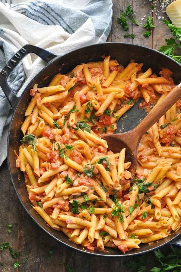 A quick and easy dinner recipe comes together in less than 20 minutes! This vegetarian Spinach Pasta is tossed in a creamy tomato sauce for a simple, satisfying and affordable meal. Add sausage, ground beef, or chicken for an even heartier dish!