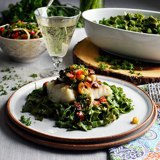 Spinach Pasta with Baked Cod and Agrodolce